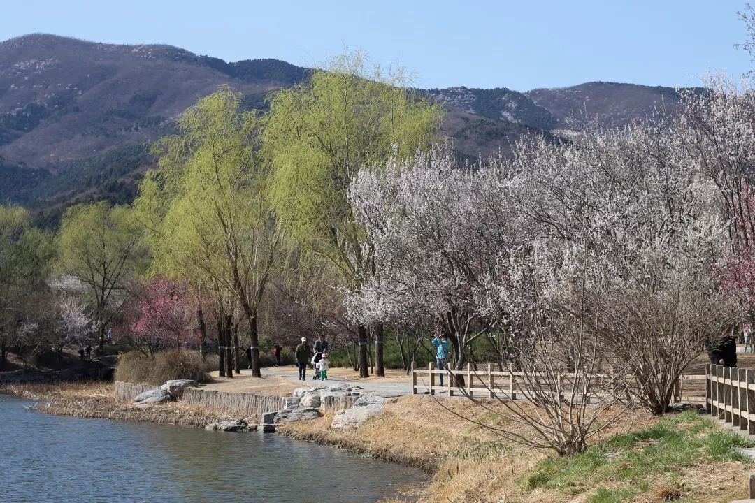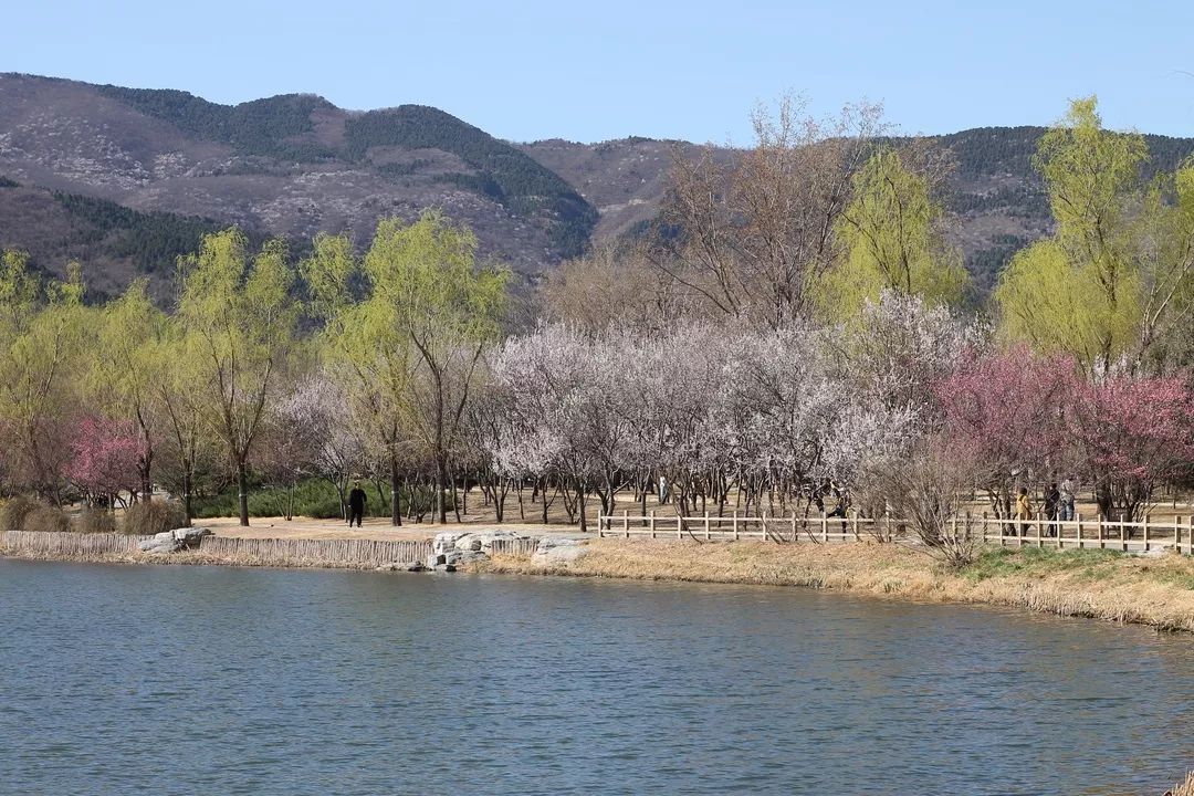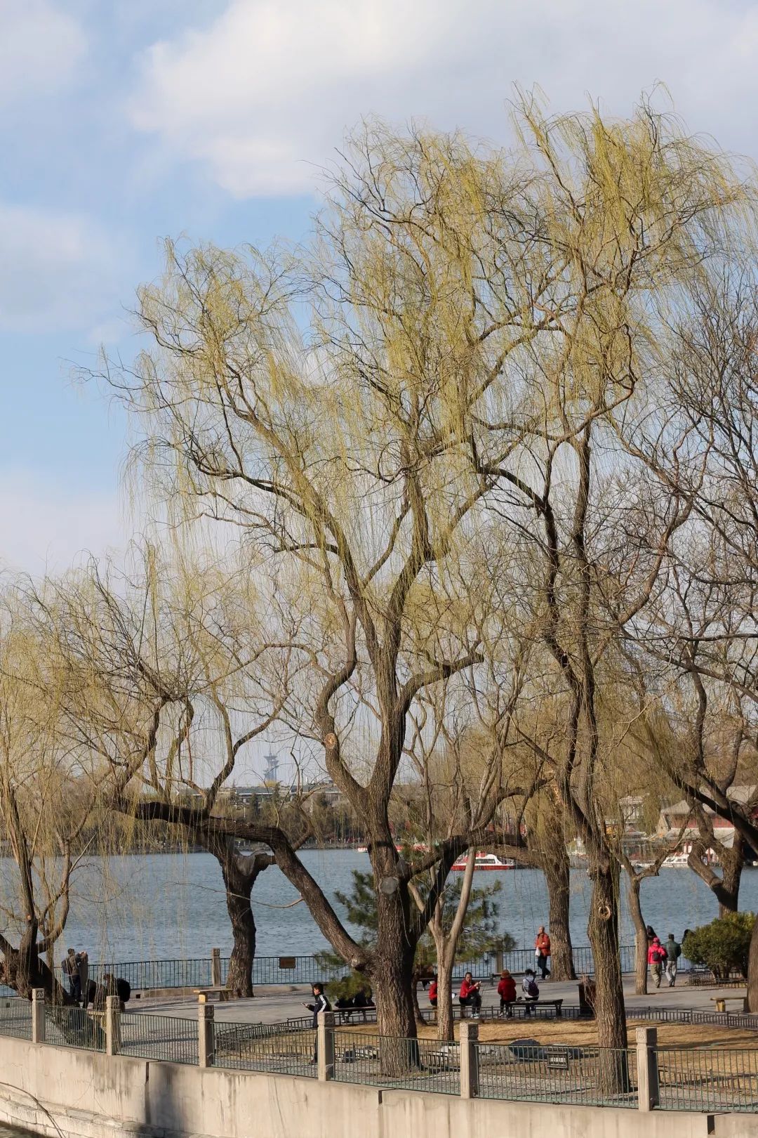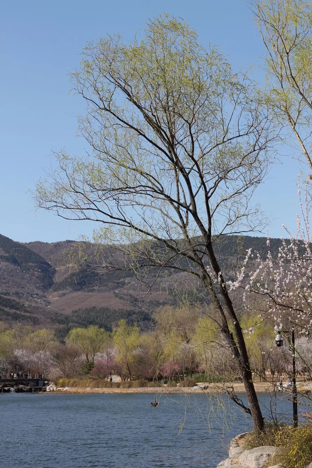 郊外的物候比城里要慢一些,可即使这样,花期也比去年早。一周之后,刚刚好是春分那天,我去了植物园。天气极好,前湖的堤岸被山桃的淡粉、柳树的黄绿以及还未开放的辽梅山杏的玫粉几种不同层次的色彩修饰着,蓝天醇澈,湖水也是青碧,恰如其分的一切,感到好像从来没有见过如此柔美的北京。