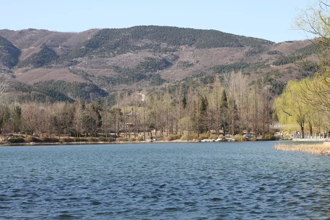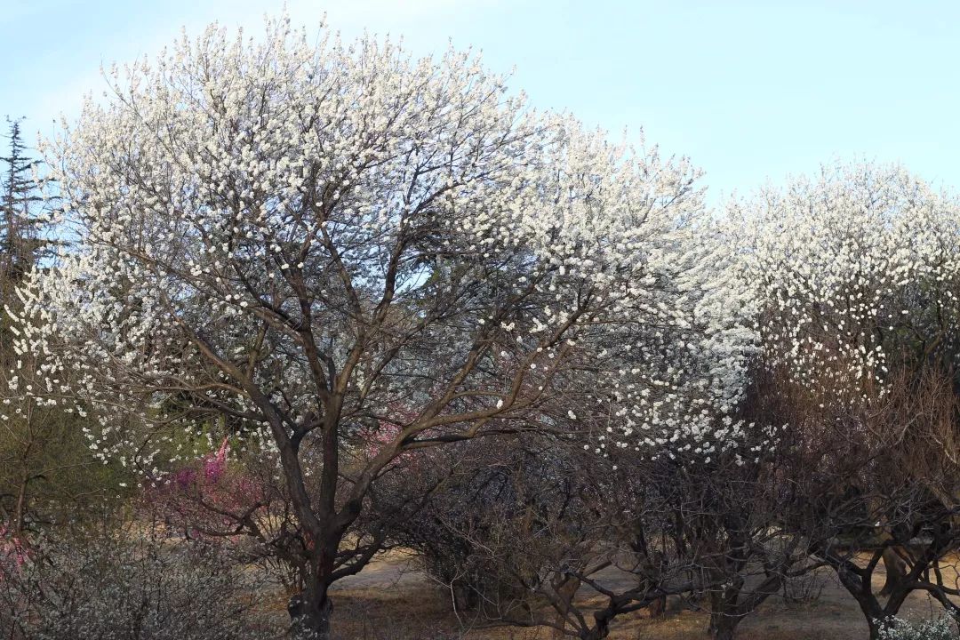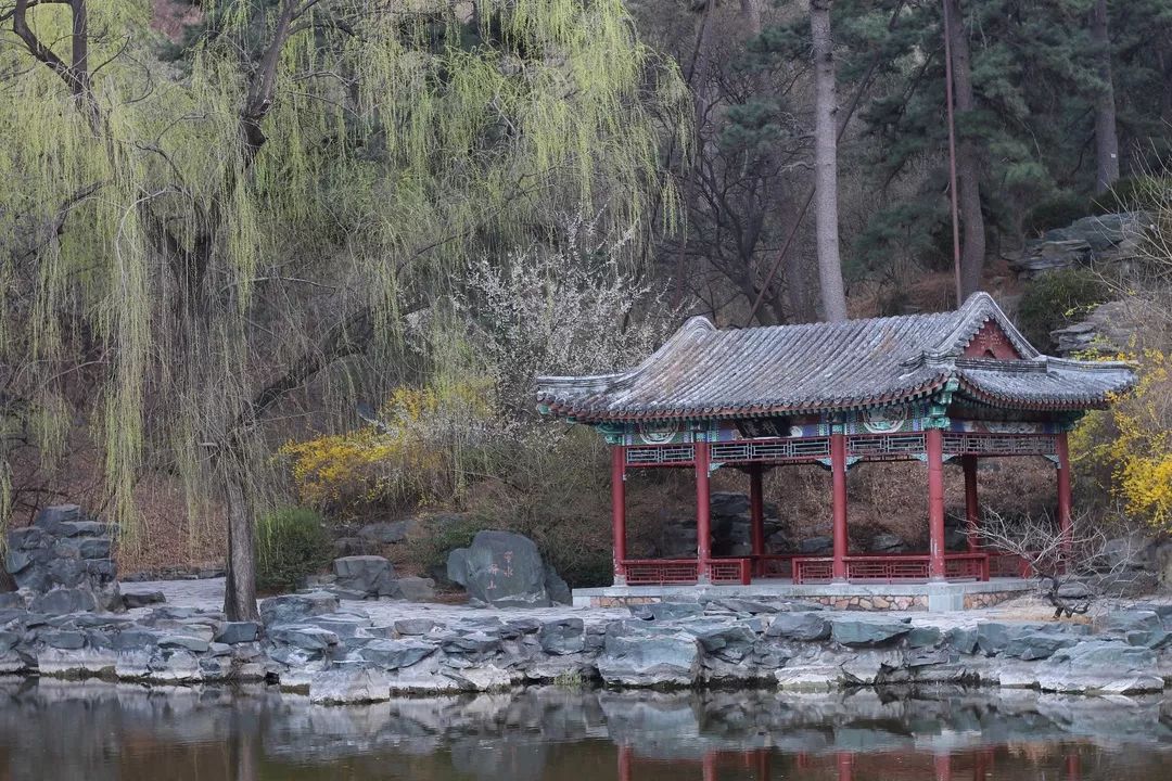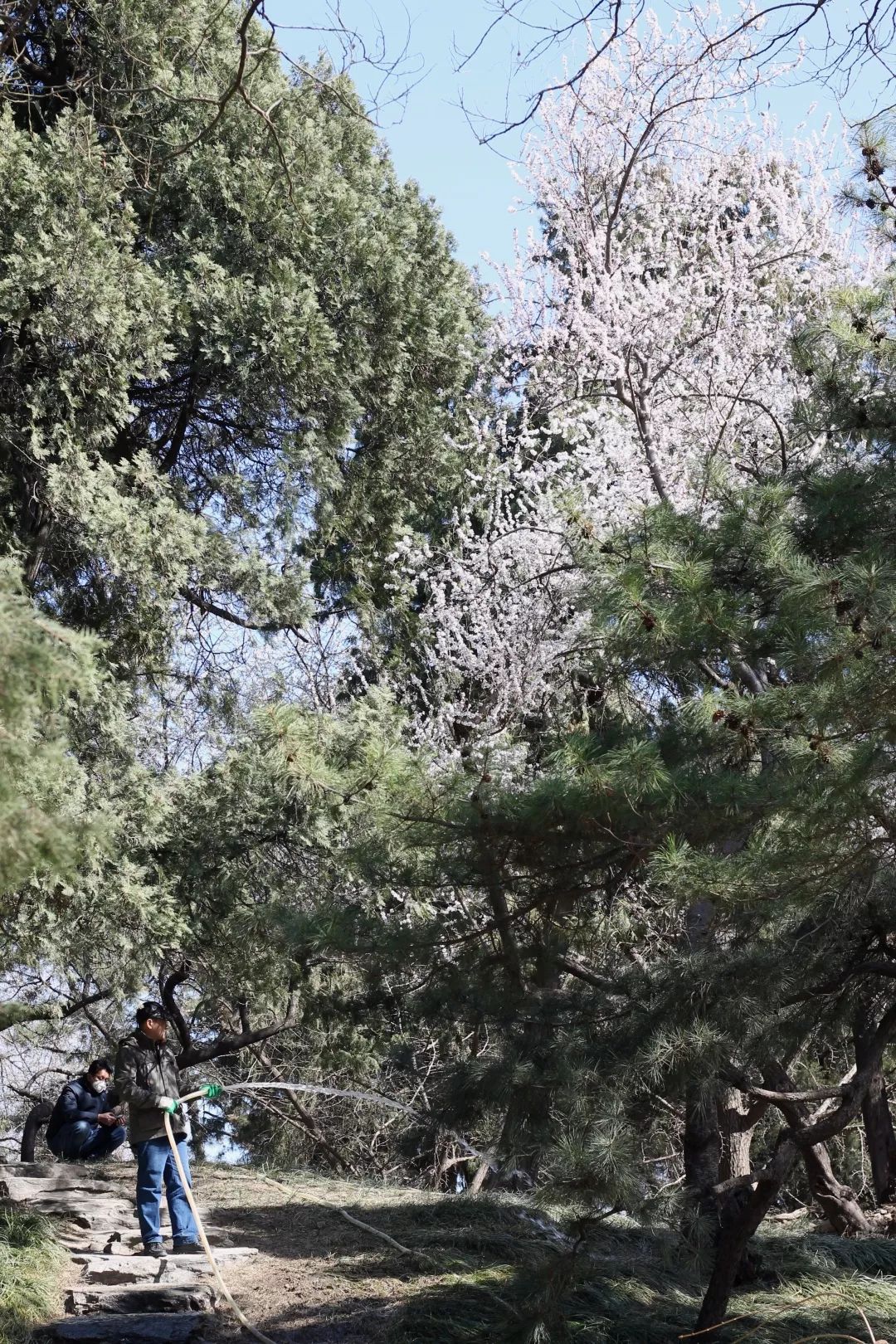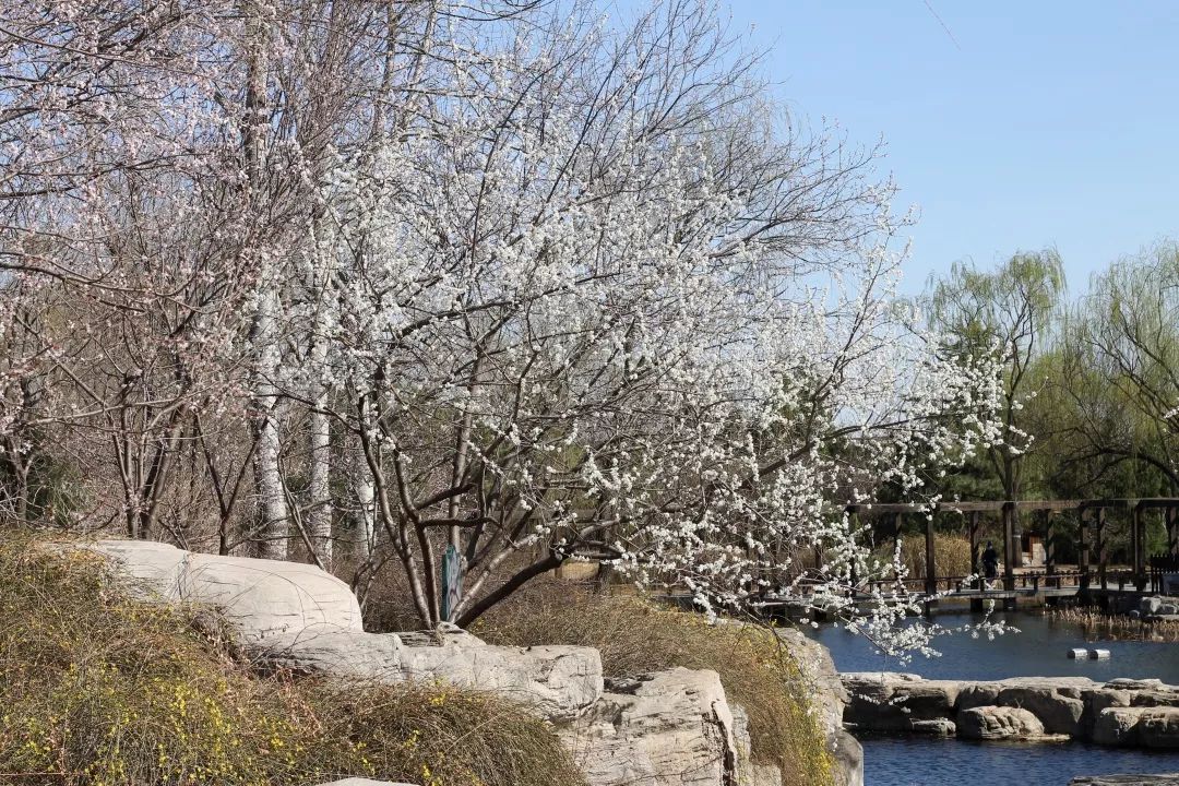 郊外的物候比城里要慢一些,可即使这样,花期也比去年早。一周之后,刚刚好是春分那天,我去了植物园。天气极好,前湖的堤岸被山桃的淡粉、柳树的黄绿以及还未开放的辽梅山杏的玫粉几种不同层次的色彩修饰着,蓝天醇澈,湖水也是青碧,恰如其分的一切,感到好像从来没有见过如此柔美的北京。