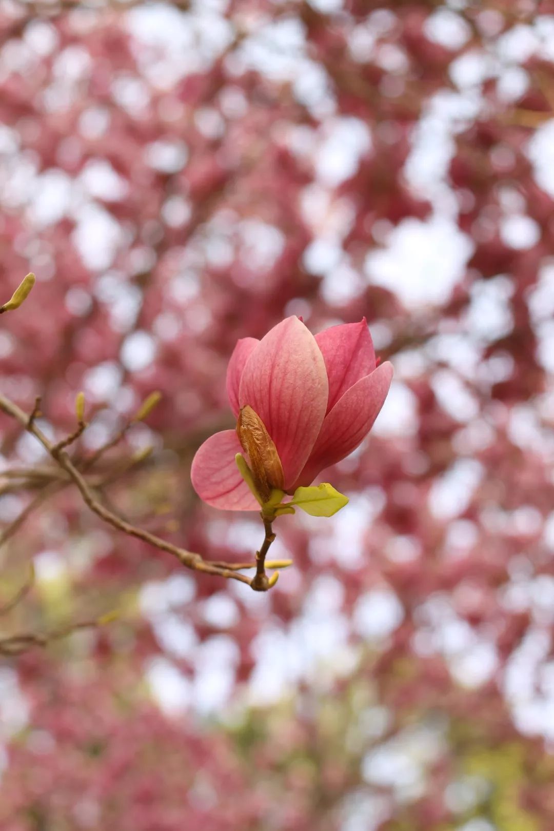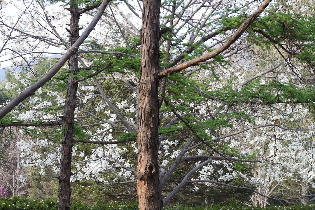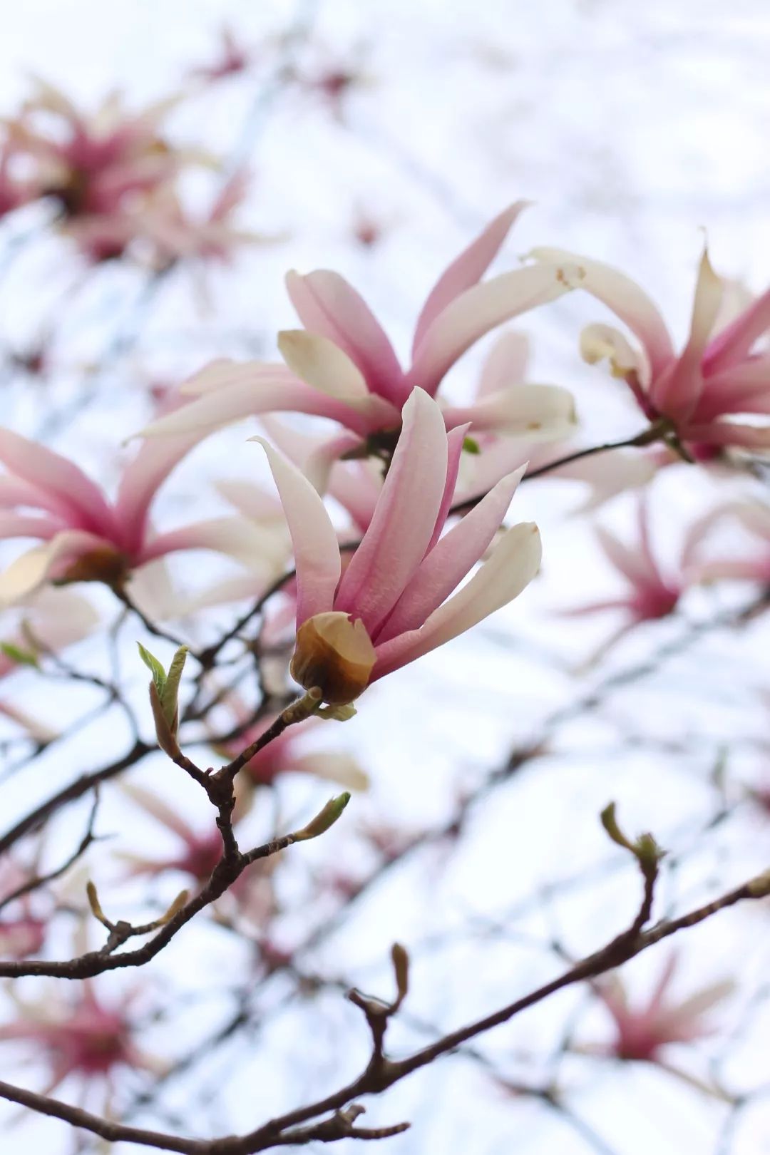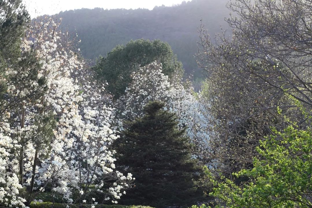 此时不同花期、不同品种的玉兰零零落落,与松柏交叠,就像一场即将结束的奏鸣曲,无声的乐韵飘荡在在轻霾的空气里。林下是早开堇菜、二月蓝一片迷人的浅紫,松林里的新绿是金银木慢慢渲染的,池塘里正在孕育着许多蚊、蝇、蜻蜓的幼虫吧,在另一处有水的的园子里已经可以听到阵阵蛙鸣了。一棵二乔玉兰,最后开成了深粉色,而偶然遇见的那棵星花玉兰,粉粉的雄蕊像是把花瓣基部也洇染上一抹粉色,如此娇嫩。一定如此,它将成为我下一个春天里的惦念。忽然想,这一片群山,以及被山揽抱的园林,实在是我太爱的地方。
