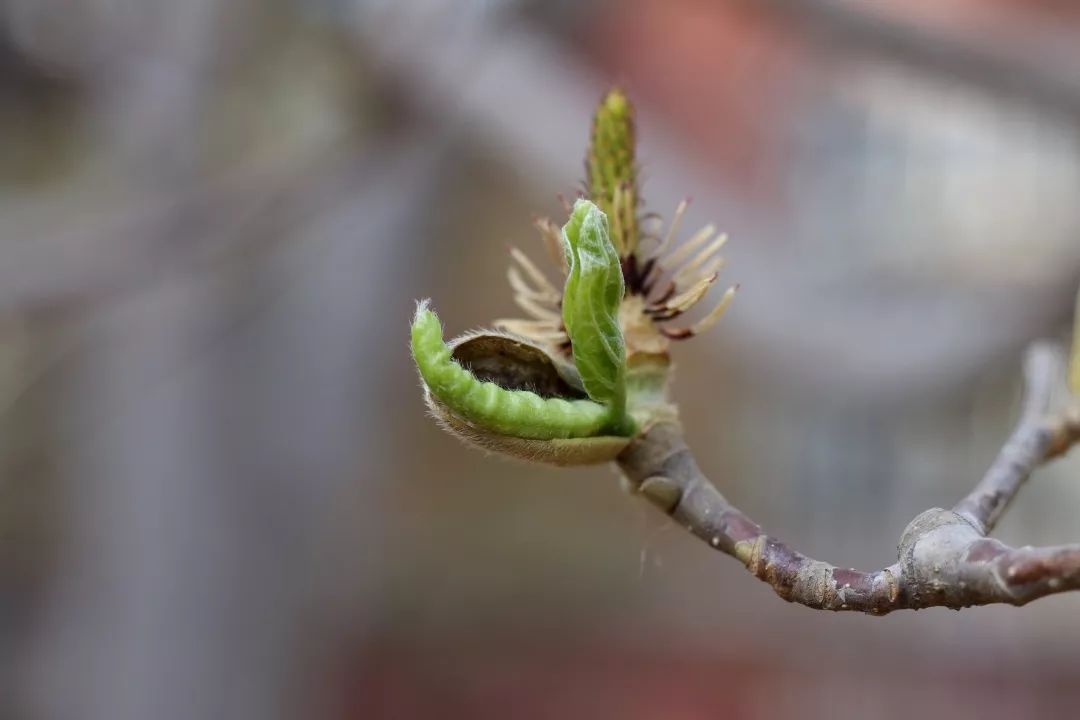 春气膨胀的那一天,玉兰花终于是要谢幕了,没有哪一年像今年这样,我对它的花朵竟然怀有一丝离情。玉兰花开过之后,雌雄蕊渐渐成熟,不再是饱含汁液的鲜嫩感,像是一场巨大的激情平息下来。雌蕊紧闭,比雄蕊更早熟一步,雄蕊完成了授粉之后,才渐渐变得干褐。我忽然发现与花一同出来的那一至两片小叶子,是被包在一个全封闭的“叶鞘”中的,有如用茧把自己裹紧的毛虫,叶子也需要刺破“叶鞘”才能钻出来(大概这个就叫“托叶鞘”?叶鞘被撑开之后成为托叶)。花生在顶端,开过花之后,枝条其他部位才开始生发出叶芽,同样的,都是一个个如带着鞘的短柄剑。