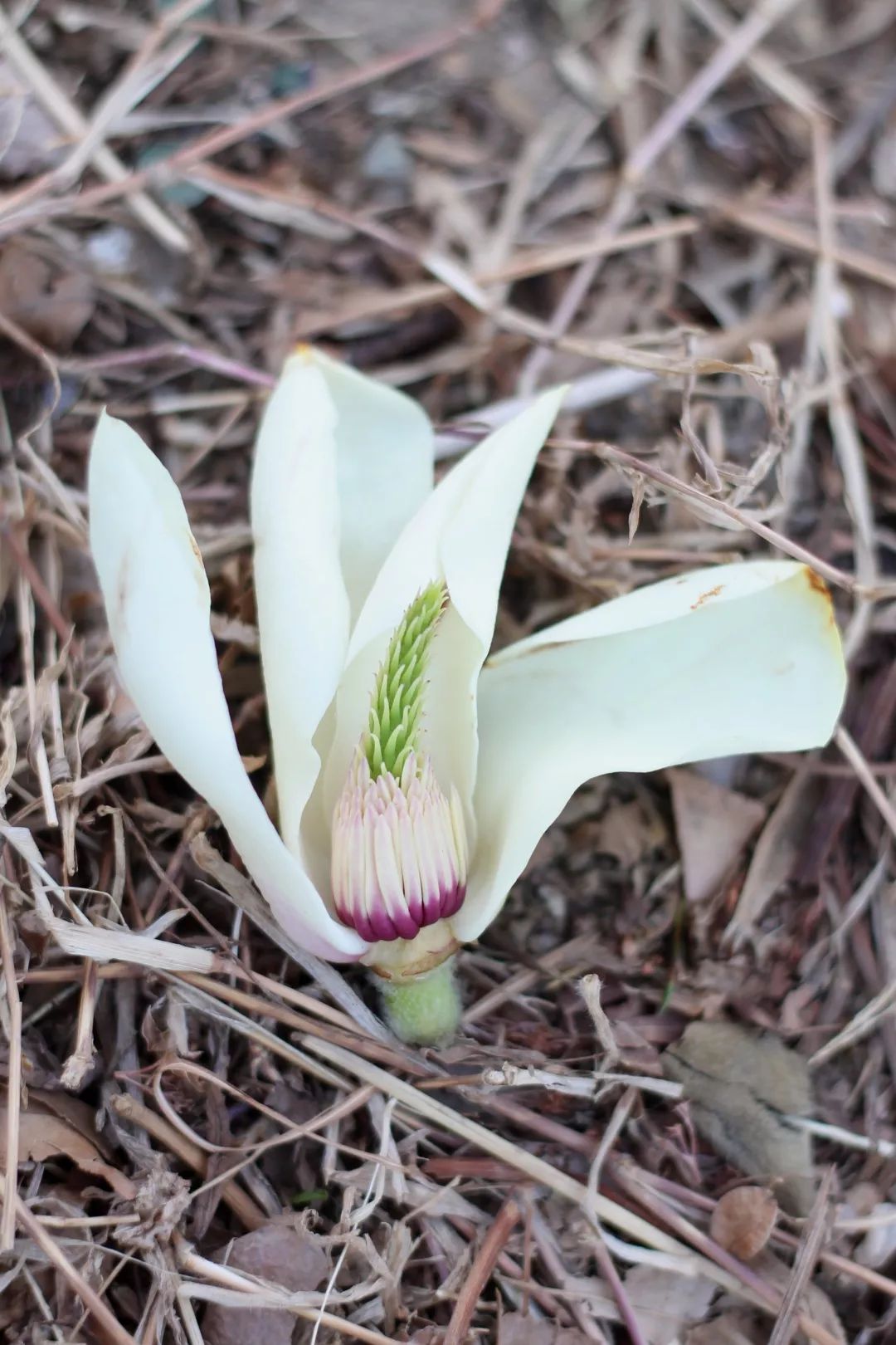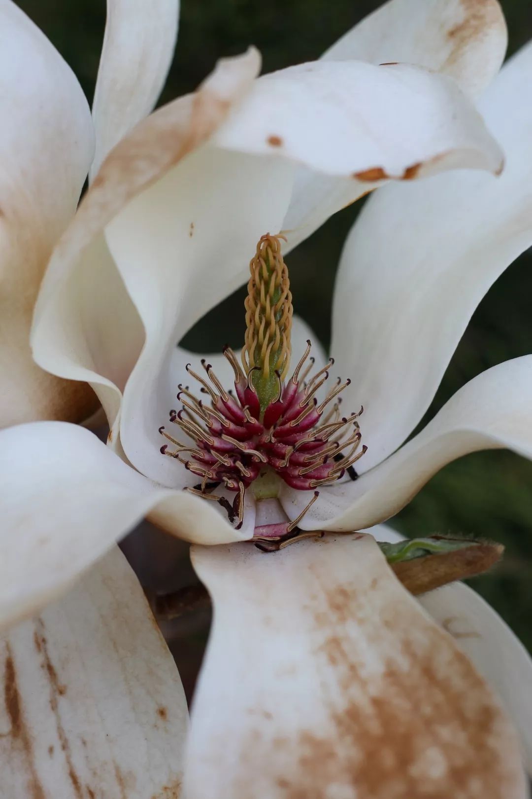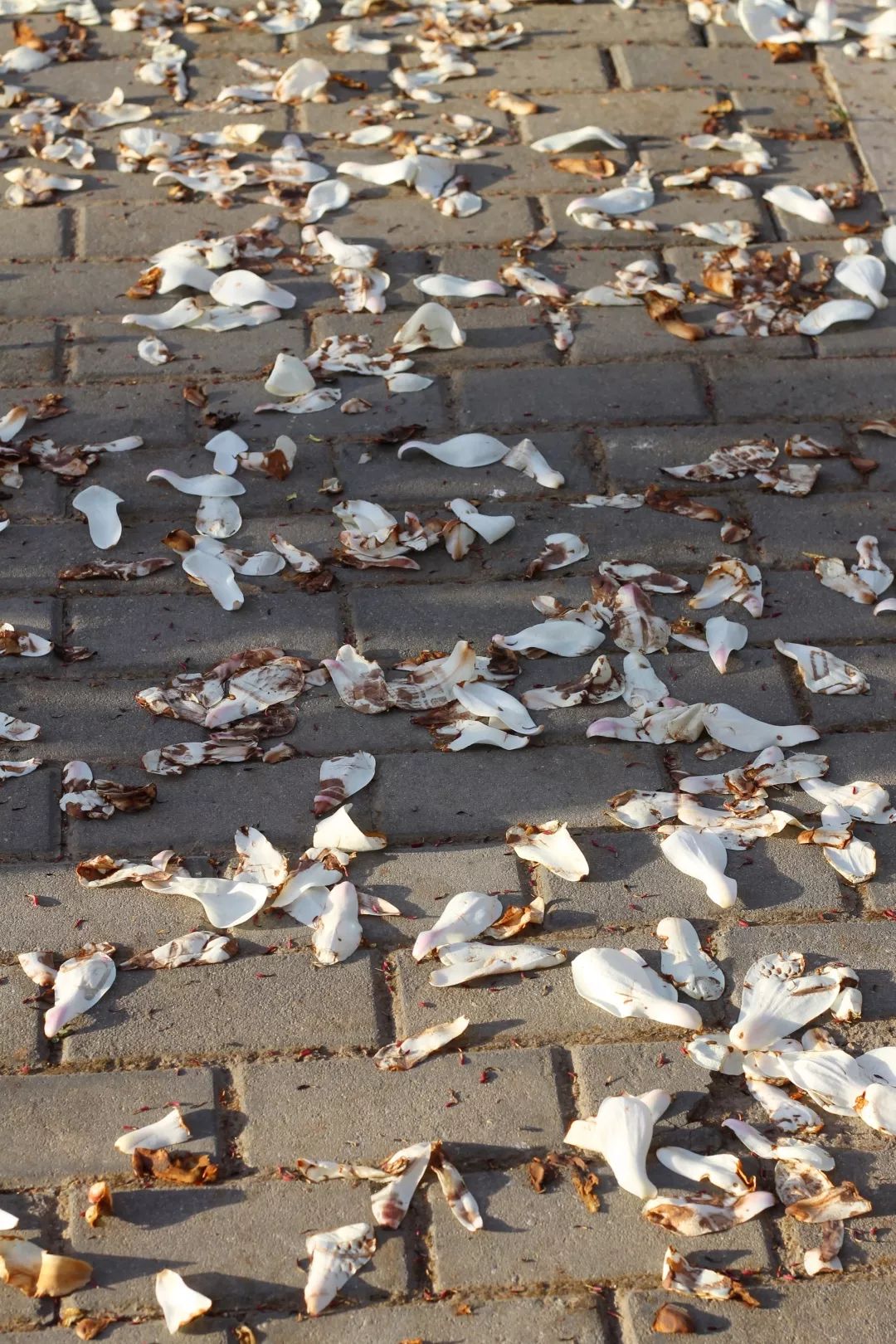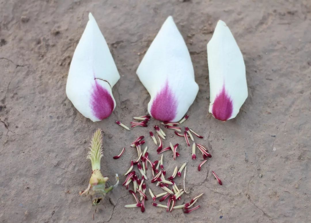 光线已经暗下来,此时拍不好整棵树了。树下掉落了几朵未开的骨朵,打开花瓣仔细看,雌蕊雄蕊都还没有成熟,香气也是同样未形成,闻起来是一种植物本身的清香。后来捡了另一朵,随便数了数,围绕雌蕊柱螺旋盘旋的雄蕊竟多达66个,剥去雄蕊之后,留下一圈排列整齐如矩阵的印痕。