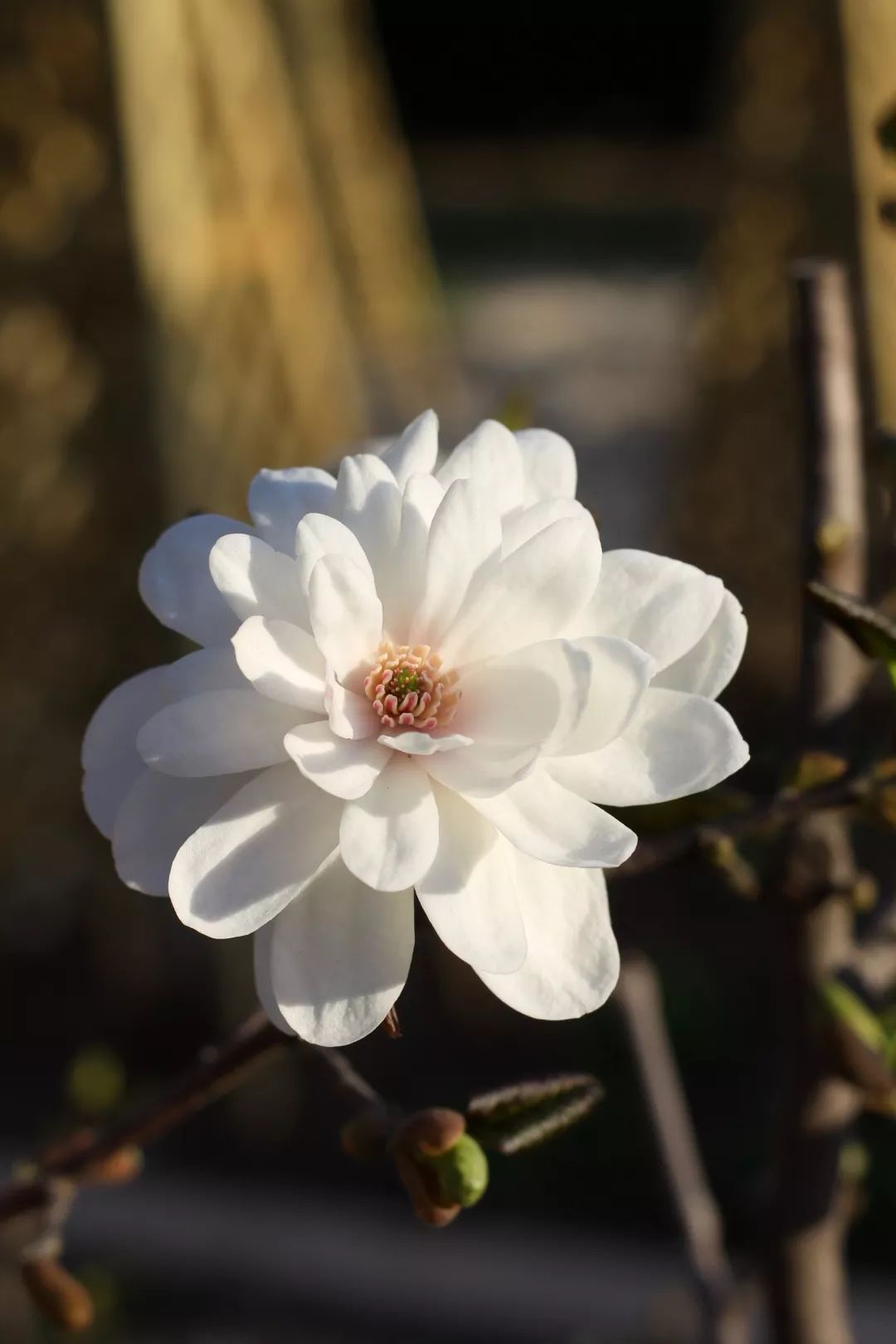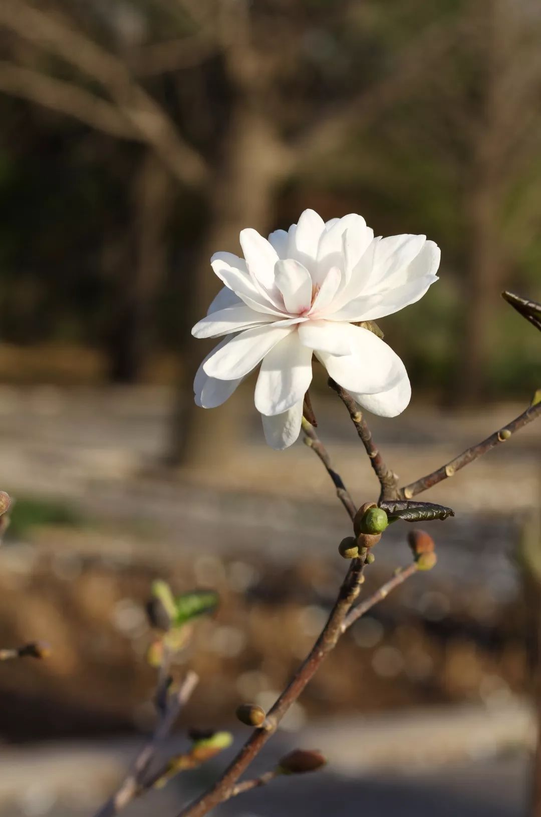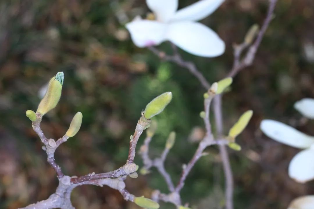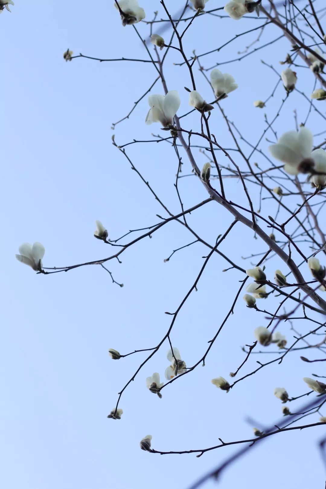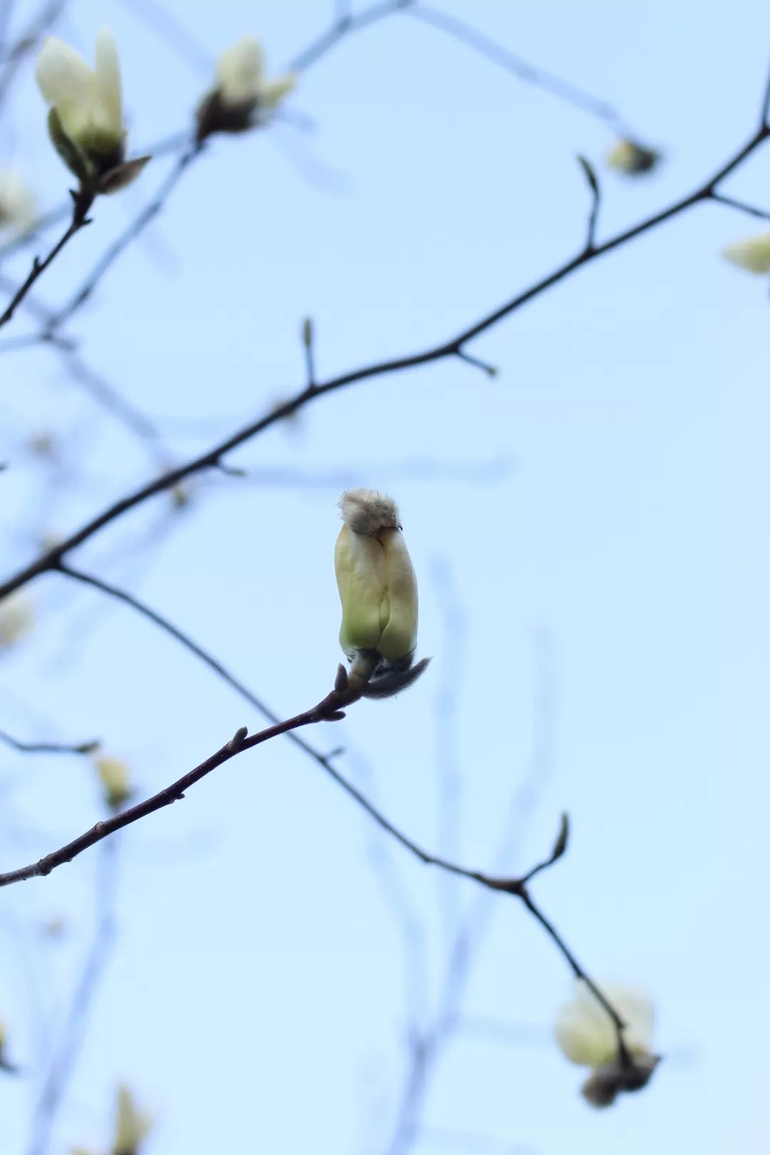 这之后,我又去看了另一棵喜欢的白玉兰。它并没什么特别,但给人的感觉总是光滑匀称的,是一棵栽培品种,花瓣纯白,枝条纤细,比起别的繁复的玉兰树,显得留白要多一些。这几年我来来去去经过它,它就总是时常入眼来。有一些花朵很有意思,并不是将芽鳞片撑裂开来,而是顶着鳞片壳在长大。