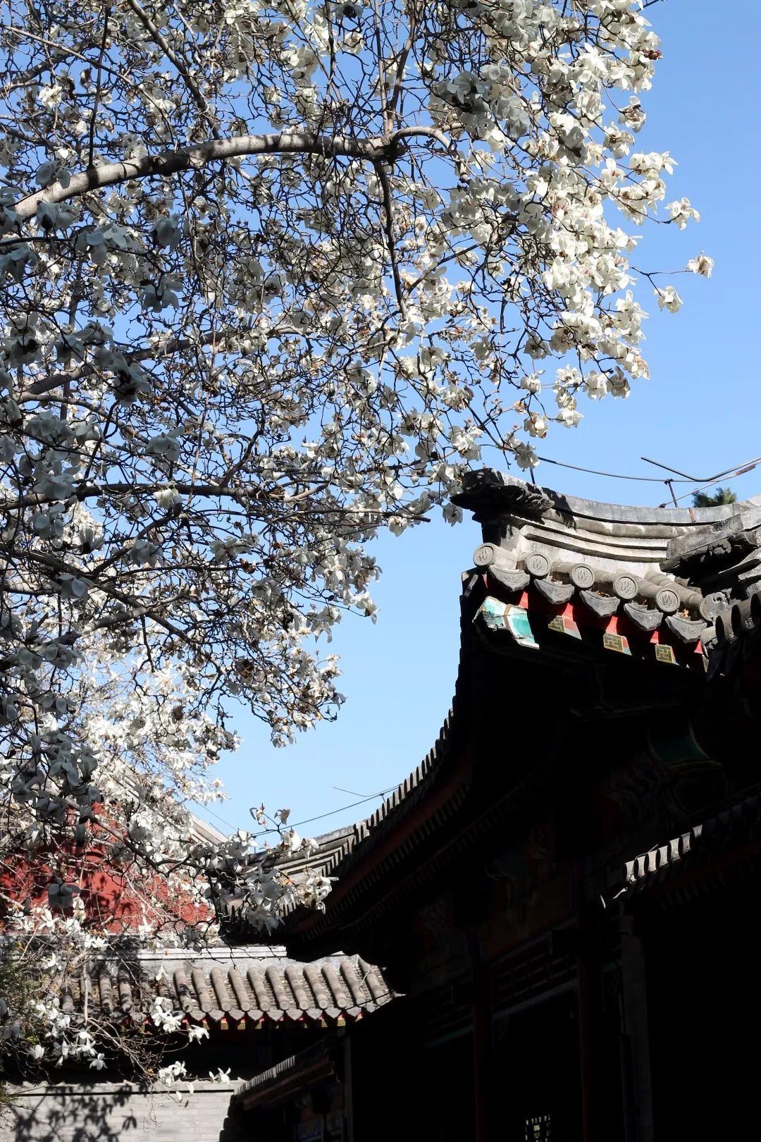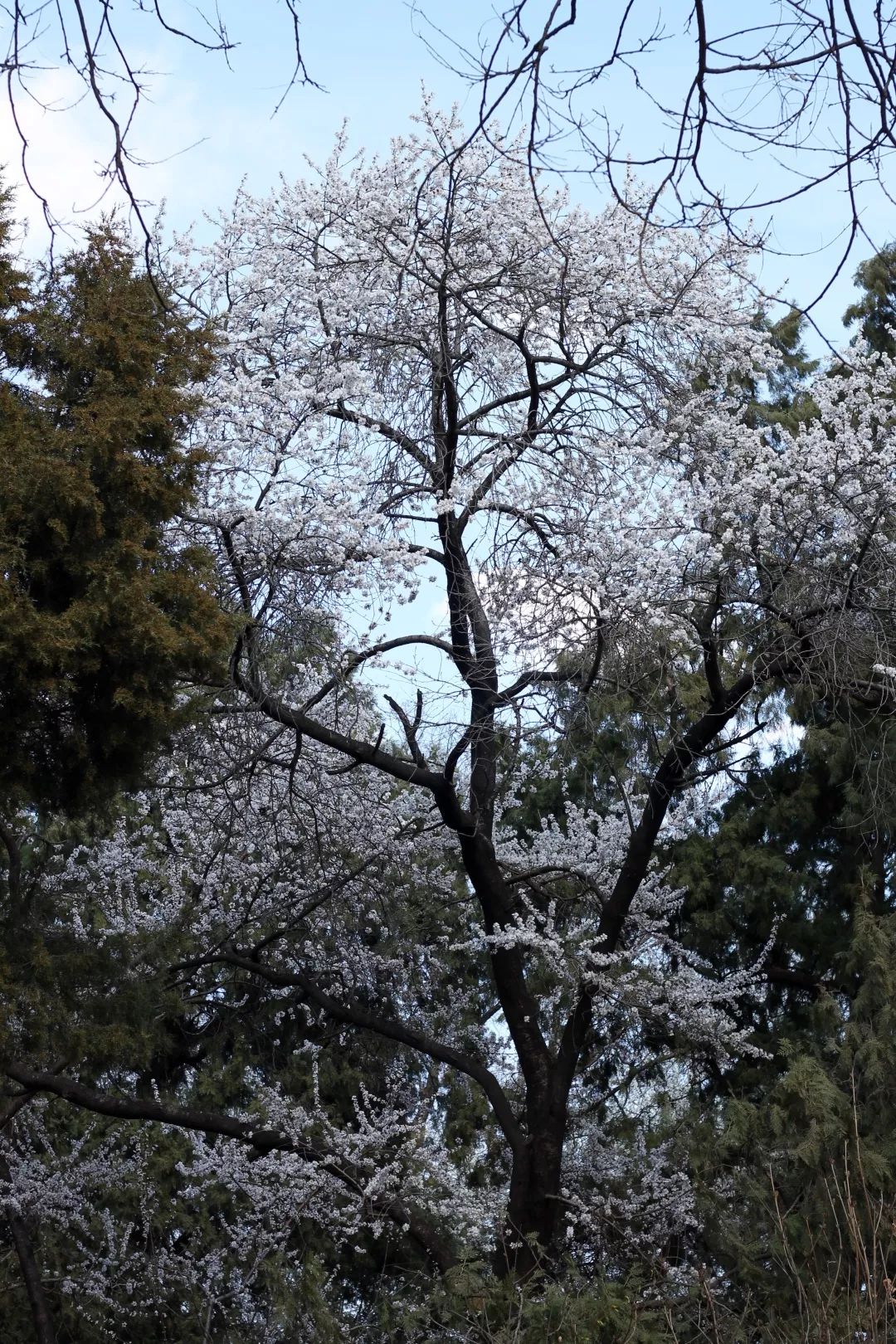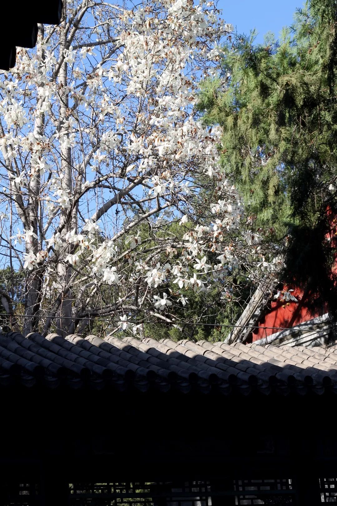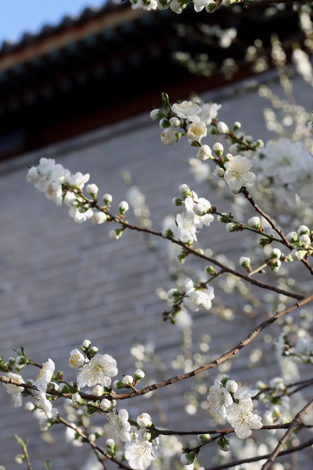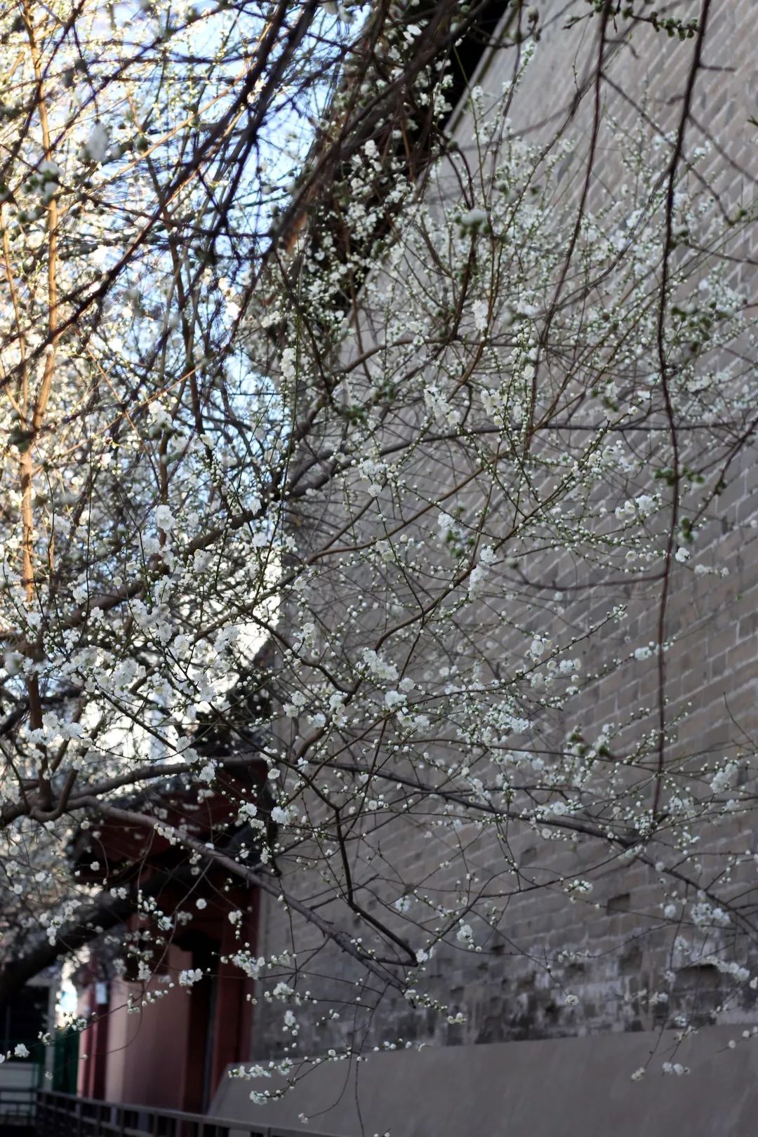 在我的手机备忘录里,还有一个今年无论如何要去看看的地方。天气晴好的一个周末,惦记着去了趟雍和宫,果然预测准确,北墙外的七棵白花山碧桃刚刚好初开花,莹白的花朵间,又有许多浑圆的小白花蕾,老树依傍着灰墙,4点多西晒的光照在枝头,风冷冷的,花枝荡漾飘柔,像是眼前有轻雪涌动。