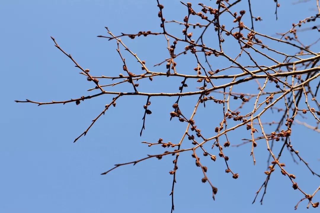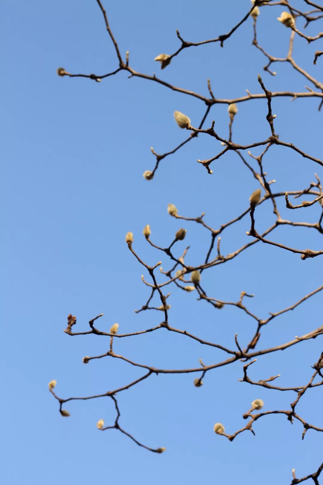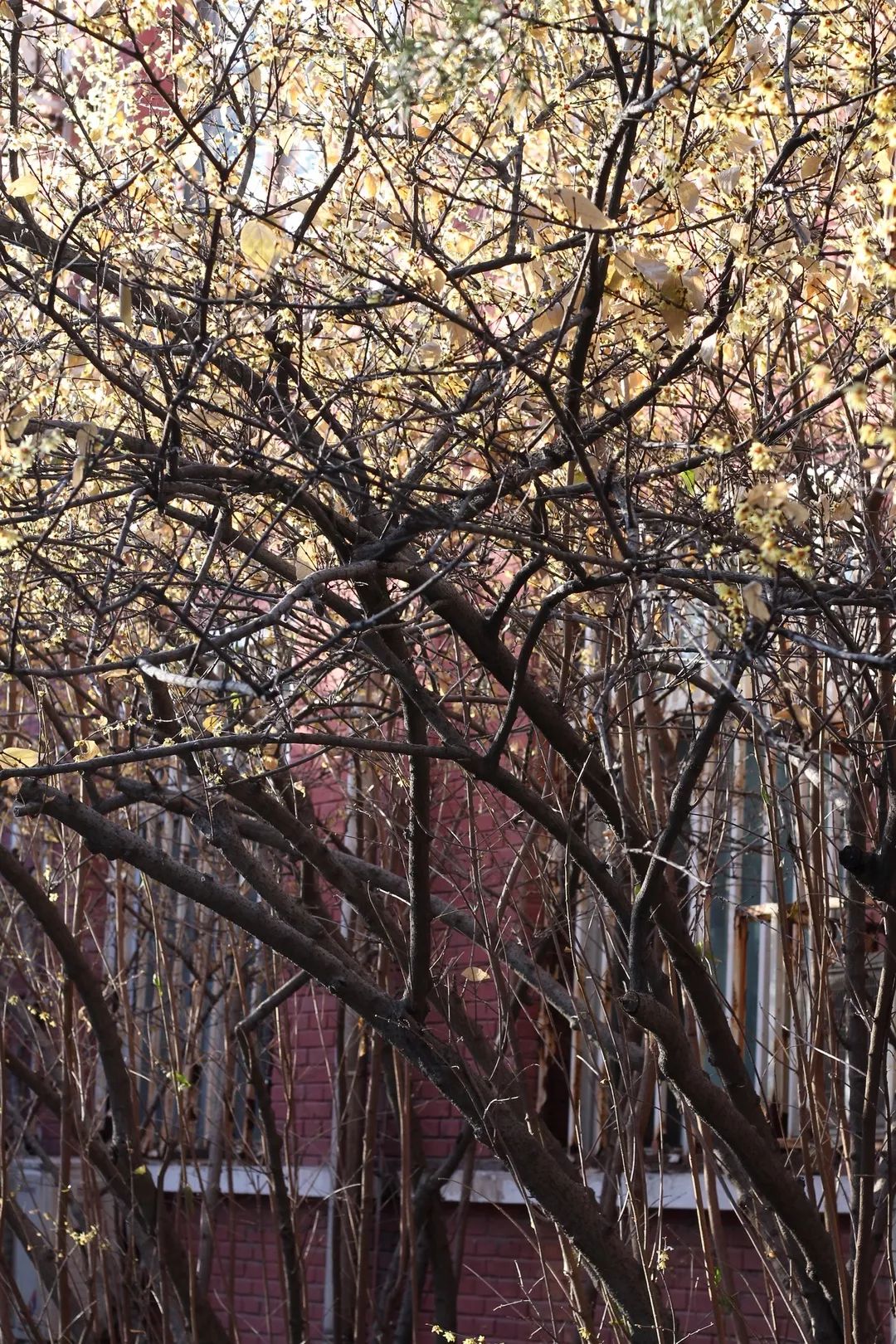 蜡梅于我而言,仿佛是一个冬天与春天的间隔符号。那一天视野里所见的,像是风暴前夕一种异常的平静。花的风暴,生长的风暴。水杉、毛白杨、加拿大杨、榛树都披挂着柔荑花序,还有鹅耳枥、榆树,这个时候的风媒树远望过去全都是一片红褐色。春天回返大地,迎春花的小喇叭早都开始广播了。林子里贴梗海棠新的花芽萌生出来,干枯在枝头的对生果实一下子就暴露了它的身份。望春玉兰也马上就要绽放了,一只喜鹊刚好飞过,而白玉兰的小枝条印在天空上,我一直都很喜欢看这种几何形状的蜿蜒,遒劲又刚硬的感觉。