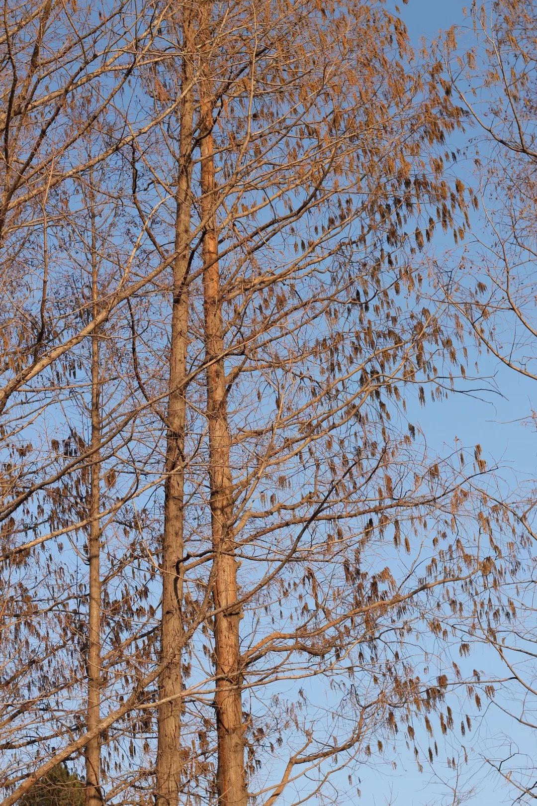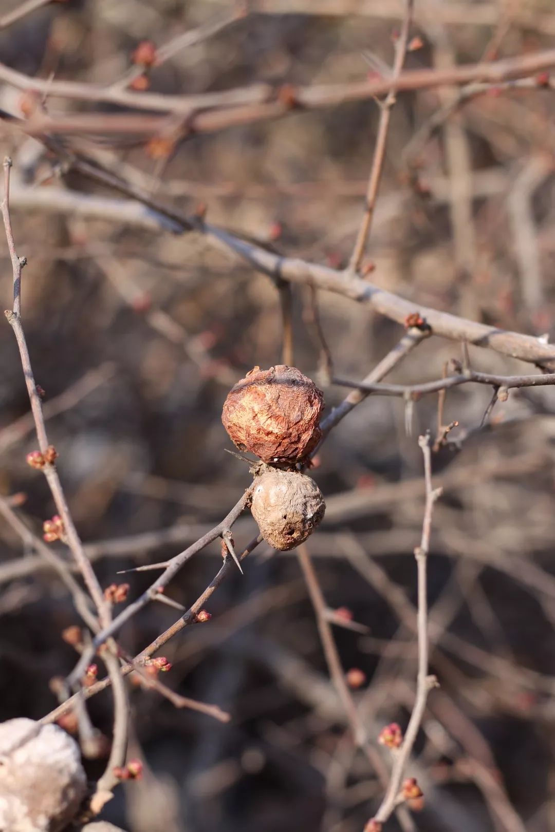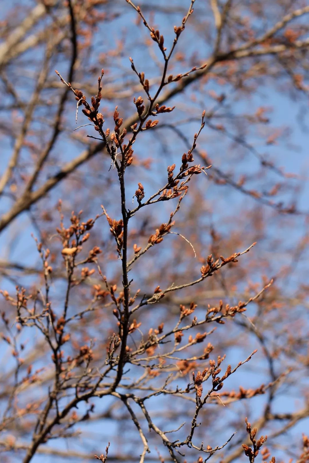 蜡梅于我而言,仿佛是一个冬天与春天的间隔符号。那一天视野里所见的,像是风暴前夕一种异常的平静。花的风暴,生长的风暴。水杉、毛白杨、加拿大杨、榛树都披挂着柔荑花序,还有鹅耳枥、榆树,这个时候的风媒树远望过去全都是一片红褐色。春天回返大地,迎春花的小喇叭早都开始广播了。林子里贴梗海棠新的花芽萌生出来,干枯在枝头的对生果实一下子就暴露了它的身份。望春玉兰也马上就要绽放了,一只喜鹊刚好飞过,而白玉兰的小枝条印在天空上,我一直都很喜欢看这种几何形状的蜿蜒,遒劲又刚硬的感觉。
