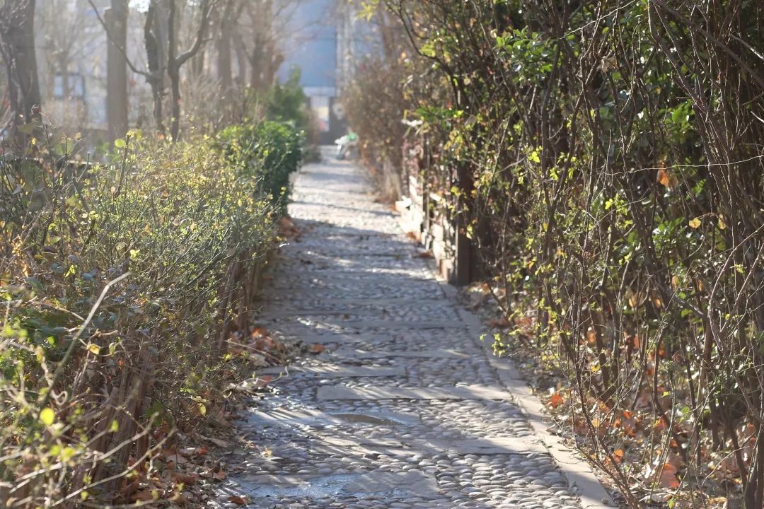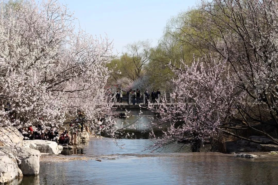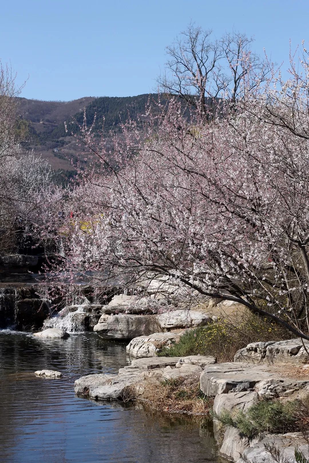 浅粉浅白的山桃临水自然是很美的,不过刚刚进园子时看到坐着休息的老人和一株迎光的小山桃,那一瞥也觉得很有意境。山桃随便地印在很普通的墙上,树影也是天然图画。溪水叠石处最是吸引人,两岸的花枝向水中央伸探交握,在任何可能取景的地方,自然都有人在拍照或者自拍,无法取到空镜,但也觉得没什么,毕竟春天的景致,本就不该是独享的。