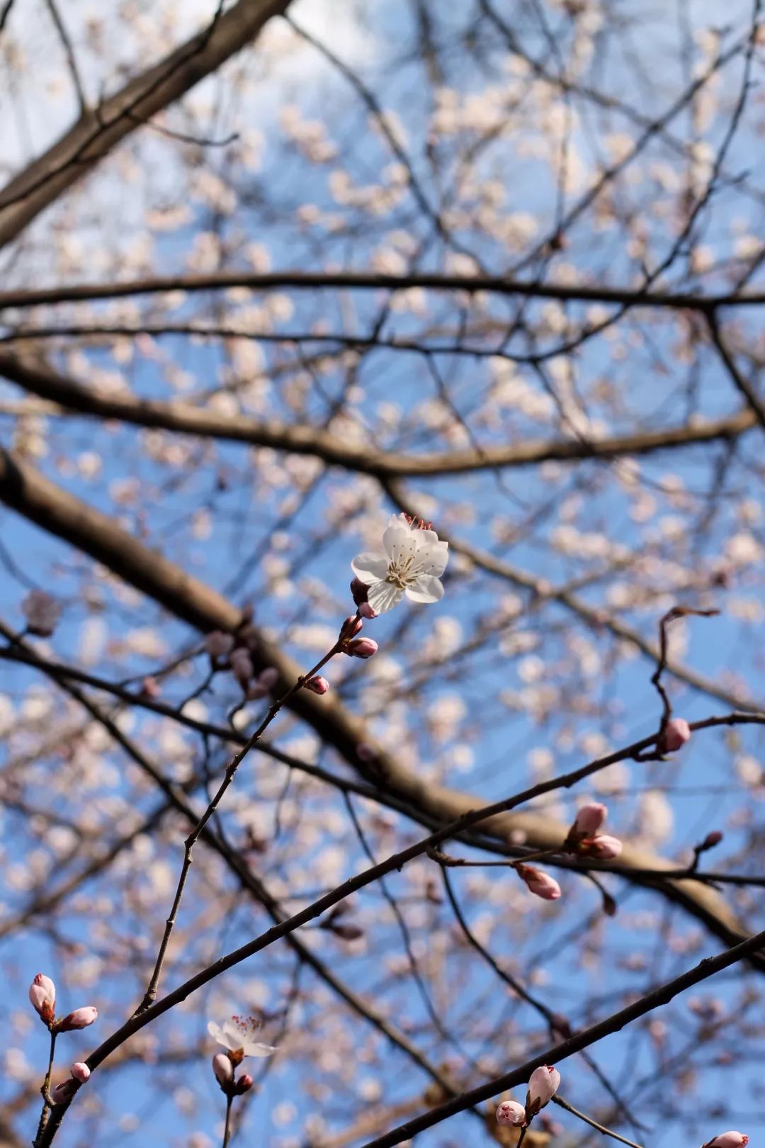 辽梅山杏成林,点点花蕾还没有完全打开,枝条间还有着顺畅的呼吸,就像有着某种均匀平稳的节奏,偶尔一两朵开出来,这个样子也觉得很美。不知是不是因为心变得宽容了,今年我开始可以接受和欣赏一点拥挤浓烈的玫红色了。后湖的色调还是“稳重”的,在油松林里,听到柳莺的归来。