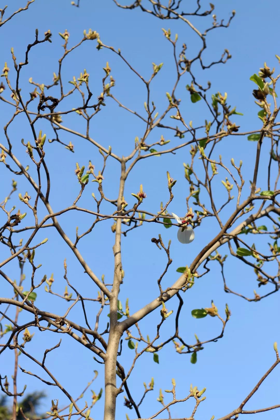 在这棵大树附近斜对的地方,又有三棵细高的白玉兰,并列而高耸,也正是刚刚开花,还有许多含苞的花芽。玉兰将开未开的时候,像是满树灯烛,托着灯烛的基座还是毛茸茸的。花开在树冠,冠幅舒展而开散,印在蓝天上,更显得莹洁清新,让我想到梵高画的那幅杏花图。此时阳光没有正午那么强烈了,玉兰的白不再显得那么灼然,太阳没有照到的枝条,变成细黑的一脉。时有大风吹起来,树冠轻微摆动,闪烁其华,绰绰约约的,还有白头鹎圆润的嗓音和斑鸠仿佛来自遥远某处的咕咕声在风中传送。玉兰初开,香气并不甚。