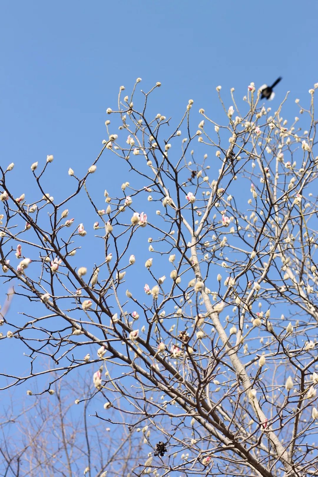 所有经过它的人都停下来抬头仰望,在它的底下转圈圈。这是一棵野生白玉兰,每片花瓣的基部都带着辐射状的紫红色。我在拍它时,总有沼泽山雀和金翅雀的声音盈耳,离得很近。当专注于看树时,甚至觉得沼泽山雀的鸣声越来越大了。去年走在这里时也听到过沼泽山雀,我猜想大概这片玉兰林是它们一年年来固定的筑巢处,但没有带望远镜,并不能追踪它们。