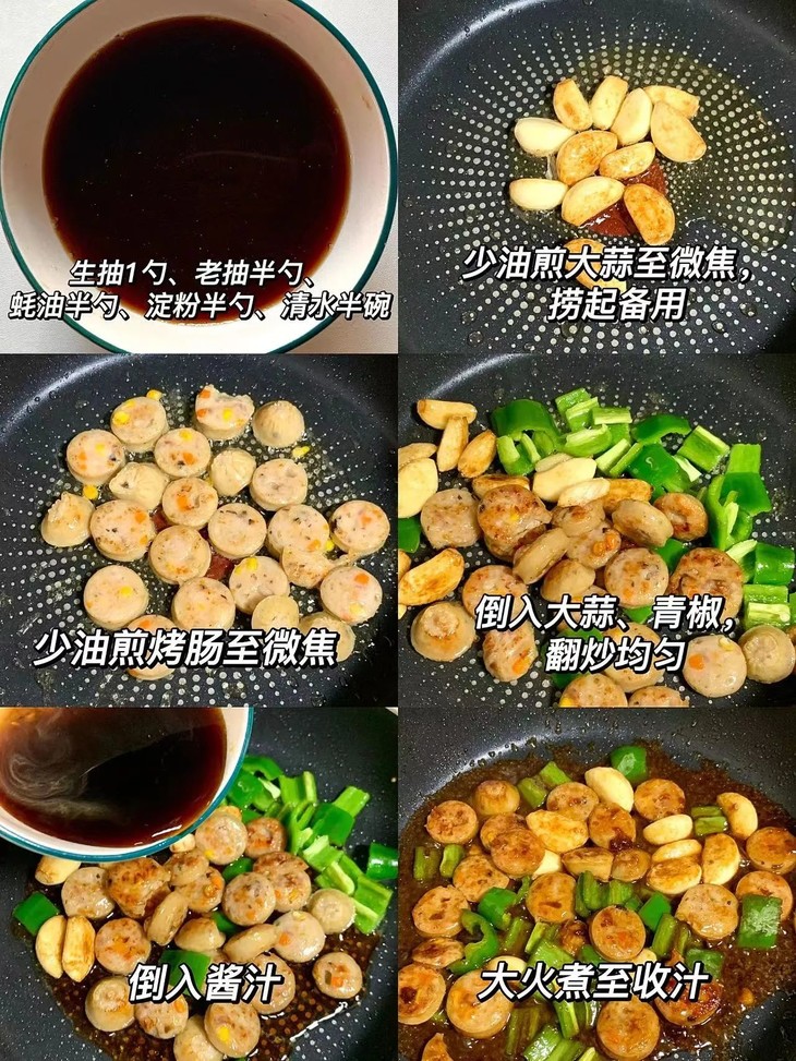 3⃣️少油煎膳食肠至两面金黄,倒入蒜头、青椒翻炒均匀。倒入酱汁,大火煮至收汁。