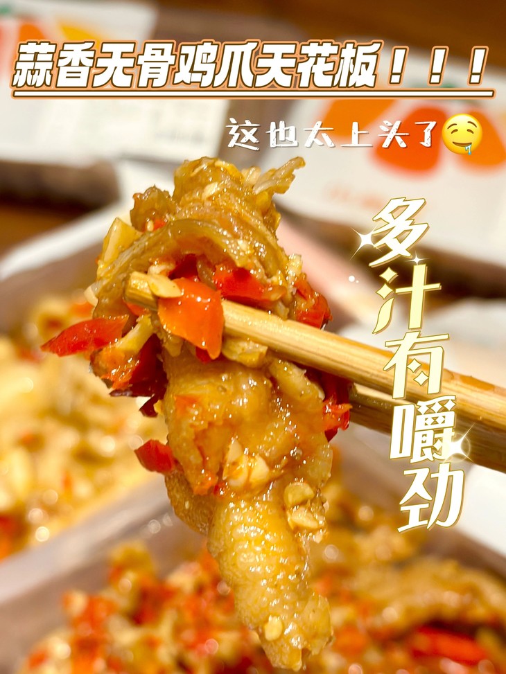 这个无骨鸡爪真的是咱们家被回购最多的产品 1000克的有微辣和中辣,不能吃辣的家人可以选择蒜香微辣哦! ✅每个都是纯手工脱骨的凤爪,保证了皮和经络的完整,吃起来更爽口dei劲。 ✅不同于普通的酸辣无骨凤爪,加入了蒜蓉调味,味道层次更加丰富 ✅多余剩下的酱汁还可以拿来拌面,酸爽可口超开胃,配上小酒一起吃,巴适得很。