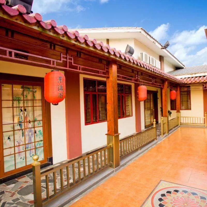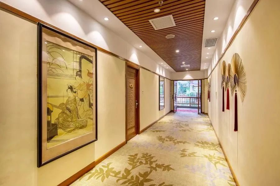 是小镇高端隐私的精品酒店,酒店拥有住客才能使用的VIP行车路径,里面分为唐宫中式风格建筑和东瀛阁日式风格建筑。
