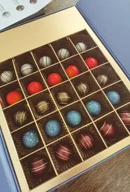 送人也十分拿得出手。魔金礼盒深蓝色的外包装就像夜空一样,打开之后,16颗或者25颗形态不同巧克力乖乖地排在一起,每一颗都很耐看,没有墨守成规的形状,生动有活力,我每次吃都感觉能找回灵气!