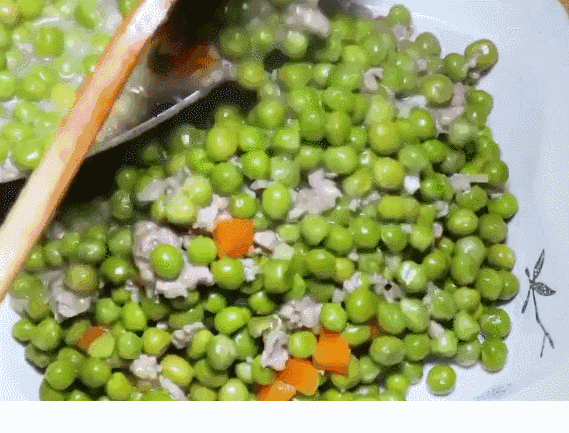 【材料】豌豆、绞肉、胡萝卜丁、姜末、蒜末、淀粉