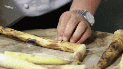 ③ 油锅烧热后,下干辣椒、葱段、姜块焙出香味,放春笋、盐翻炒入味;