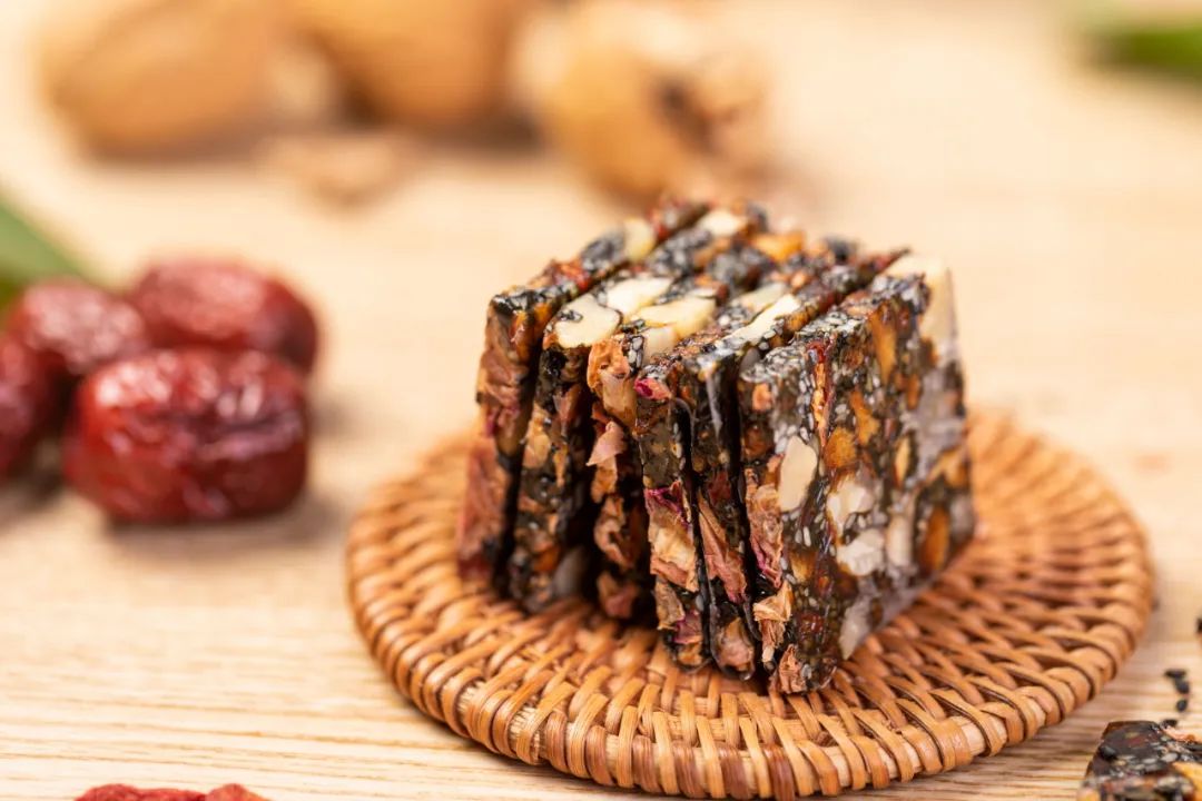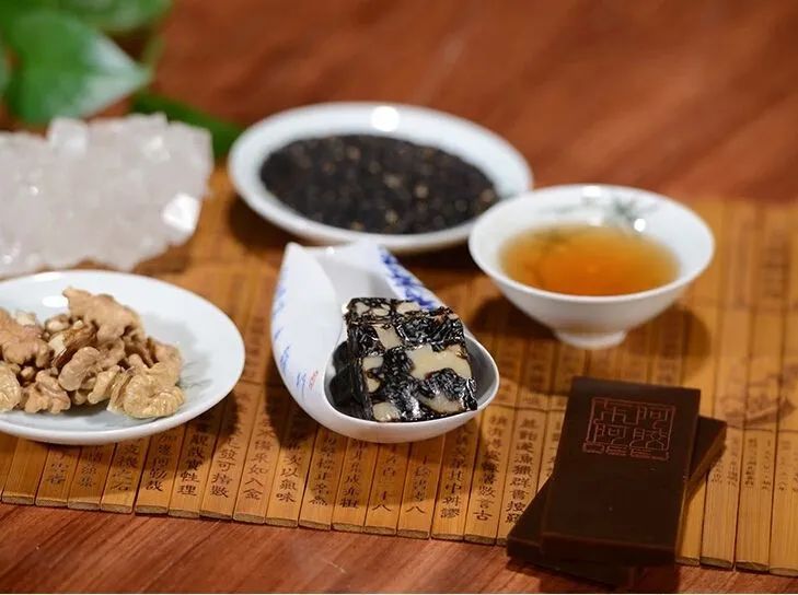 原料:东阿阿胶、黄酒、黑芝麻、核桃、冰糖、白扁豆花、淡竹叶、薄荷叶、生山楂,然后熬制成阿胶糕即可。