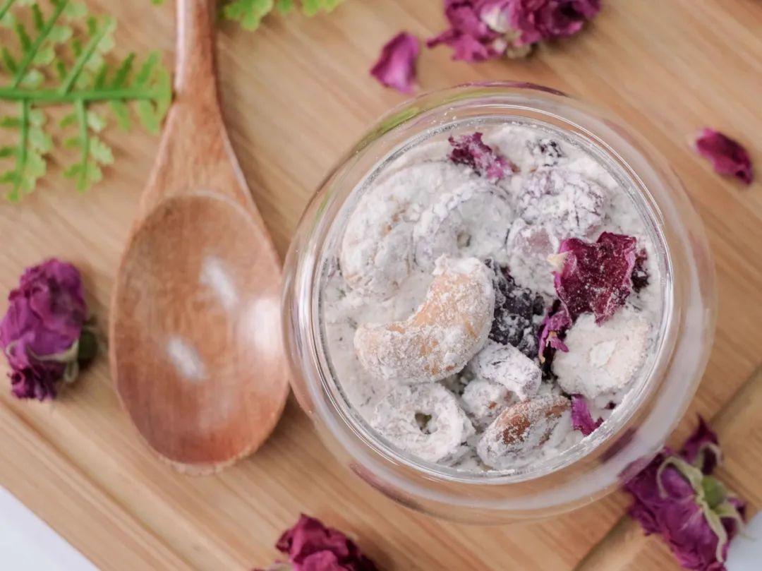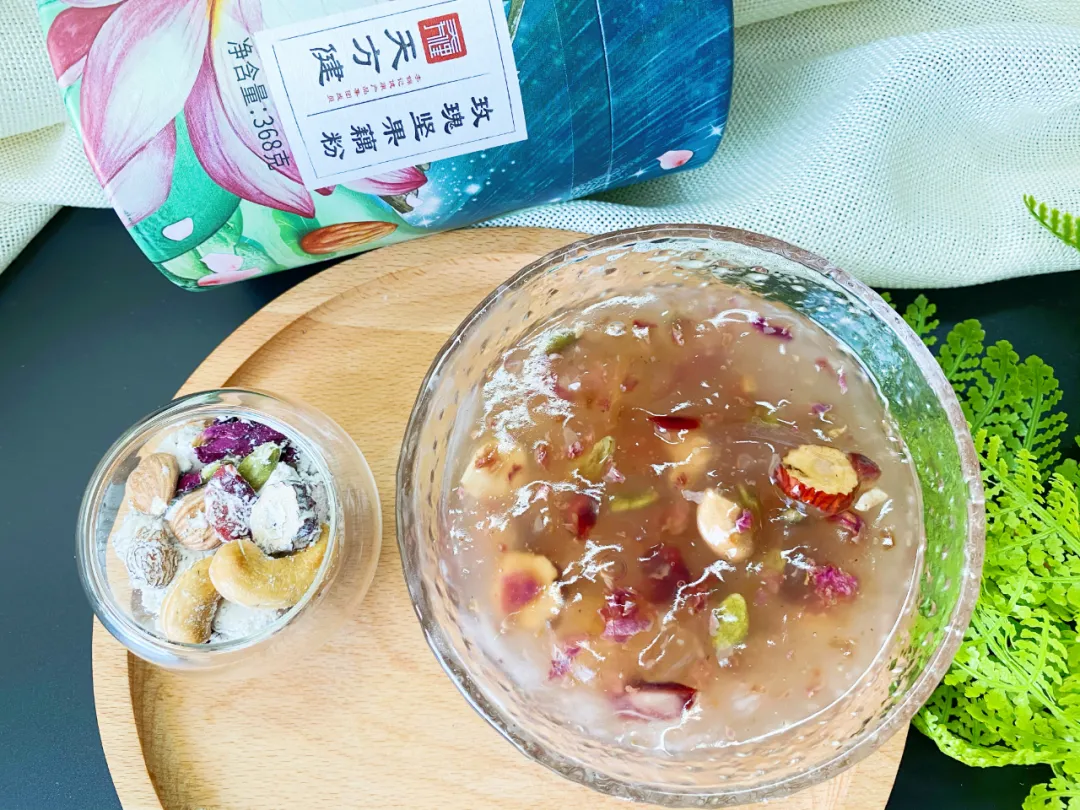 平日里没有太多时间煲粥、蒸煮早餐的话,其实可以选择一些冲泡类的代餐轻食,譬如“玫瑰坚果藕粉”。