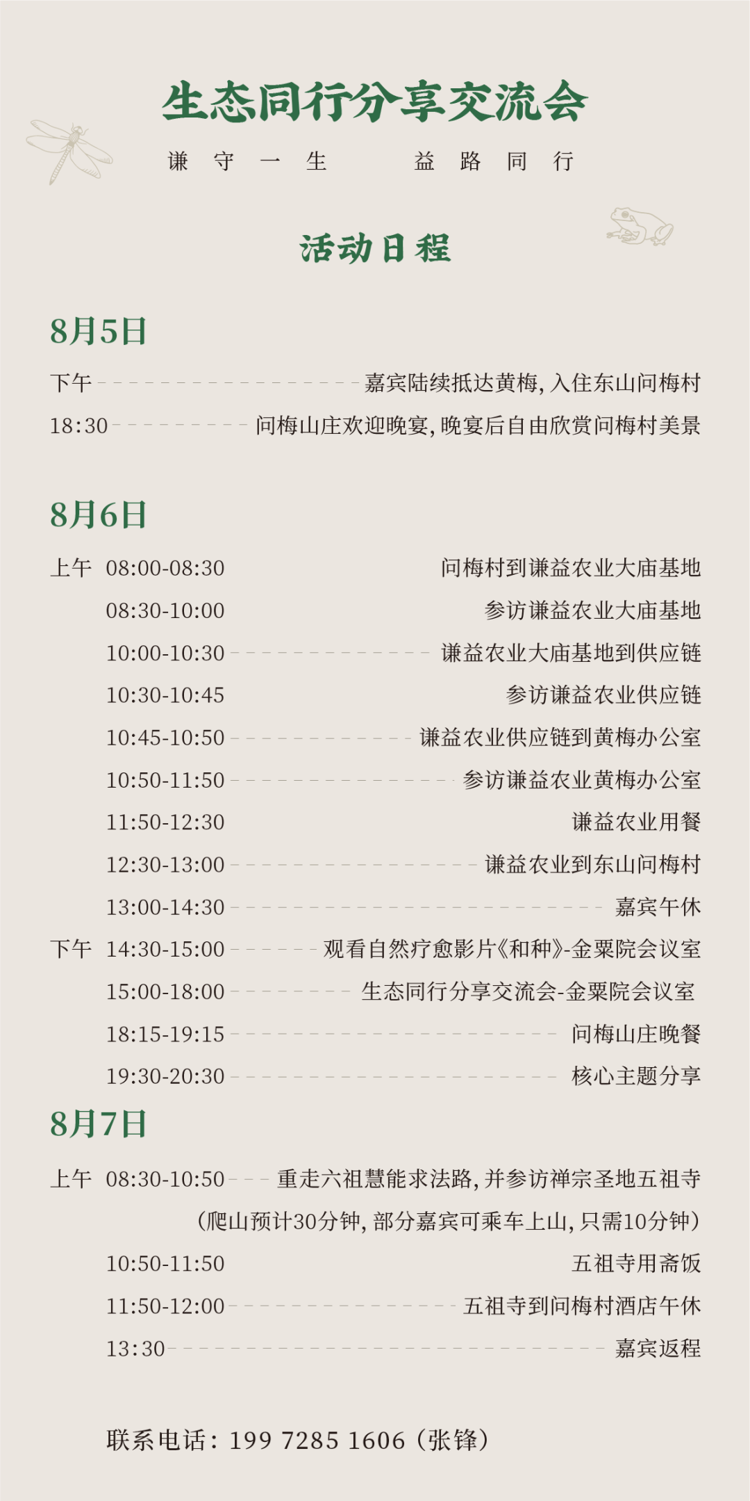 本次周年庆活动主题为:谦守一生,益路同行,生态同行分享交流会。就是想邀请大家一起来谈谈彼此的初心和未来。从8月5日到8月7日,为期三天,让我们把酒言欢,共话桑麻。