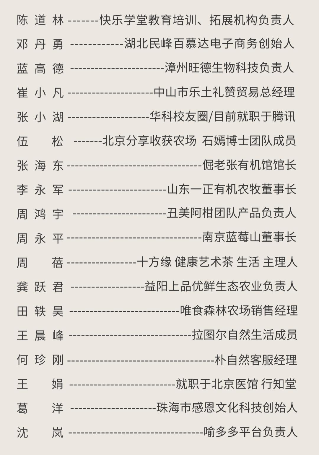 曾经担任广东、上海等地素食酒店高级行政总厨,二十多年的素食行业领域经验,对各类生机蔬食自然疗法以及科学健康营养食材搭配有着丰富的经验,曾多次参加北京、上海、台湾以及香港的各类健康养生培训课程及有机生食疗法工作坊。以下是参会嘉宾的名单。(排名不分先后)