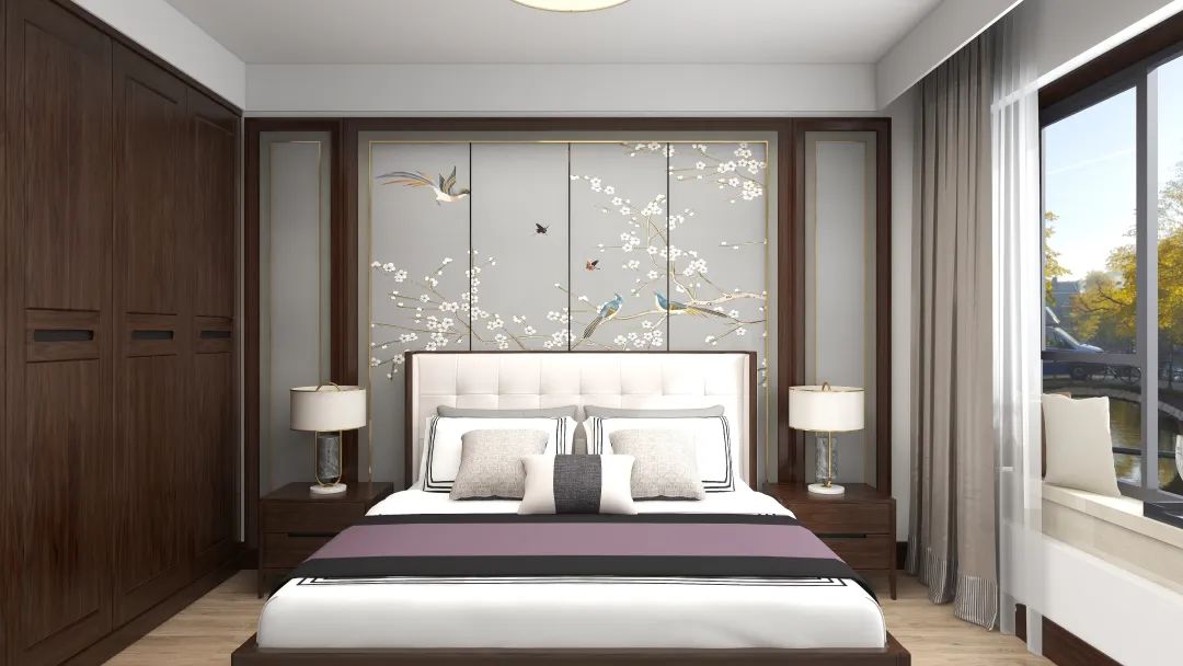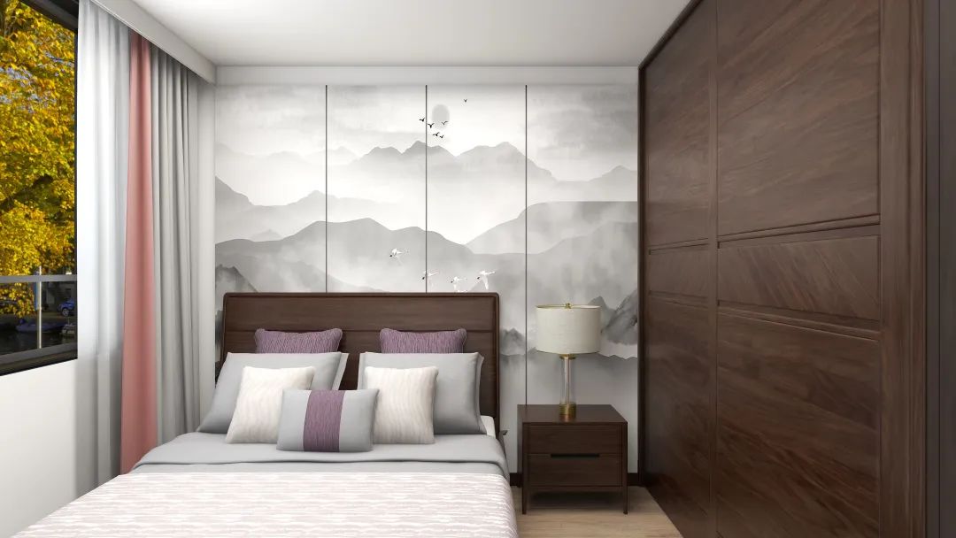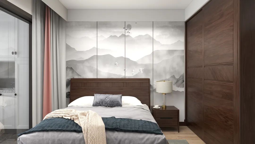 在本设计案例中,卧室空间的衣柜与壁画相得益彰,搭配造型简洁的床头柜,兼具功能性与美观度,中式造型的墙饰寓意着一种生生不息向上的生命力。在深邃稳重的北美黑胡桃家具映衬下,让人仿佛身在大自然的感觉,散发出慵懒的气息。