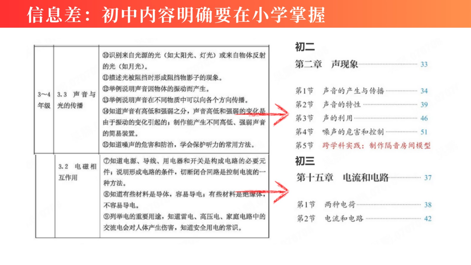 原先初中课本中才有的知识,已经下沉到小学课程目标中,比如这个声学的知识点,初二初三才会涉及到,现在小学三四年级就要学