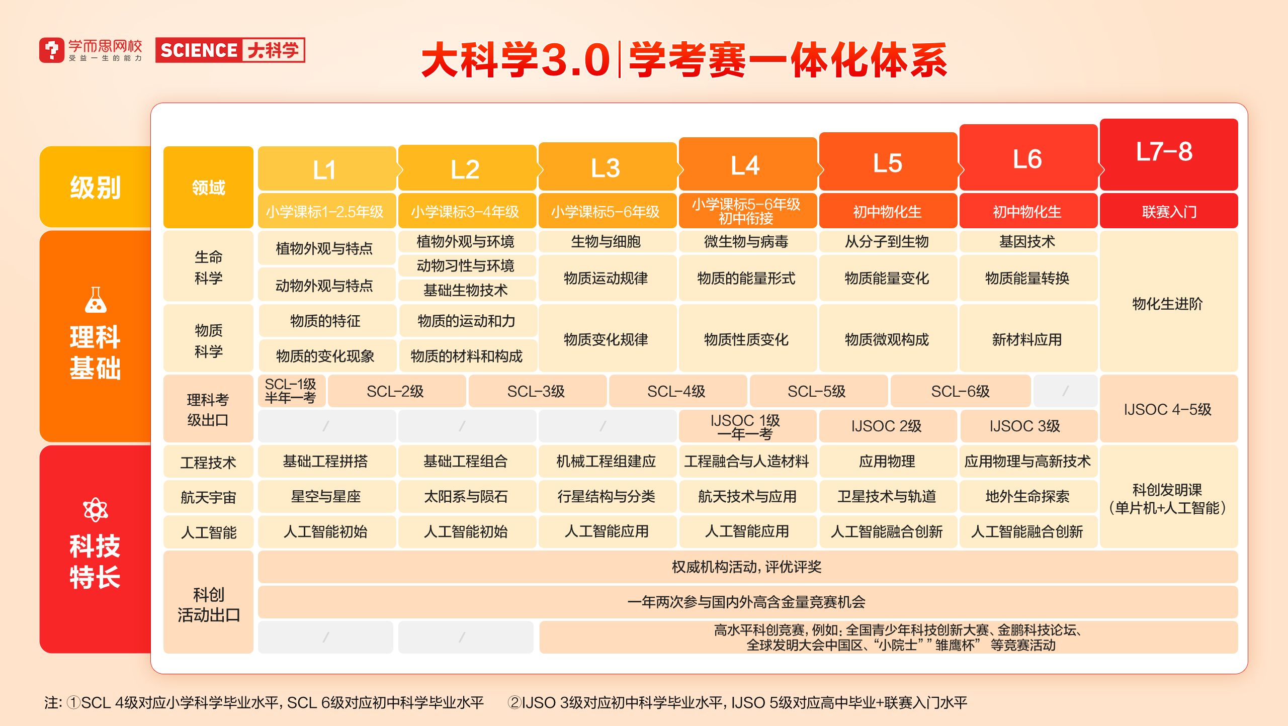 第二个是SCL考级,青少年科技素养水平测试,类似于我们熟悉的英语等级考试、各种乐器等级考试,只不过它对标的是孩子的科学水平,4级对标小学科学毕业水平,6级对标初中科学毕业水平