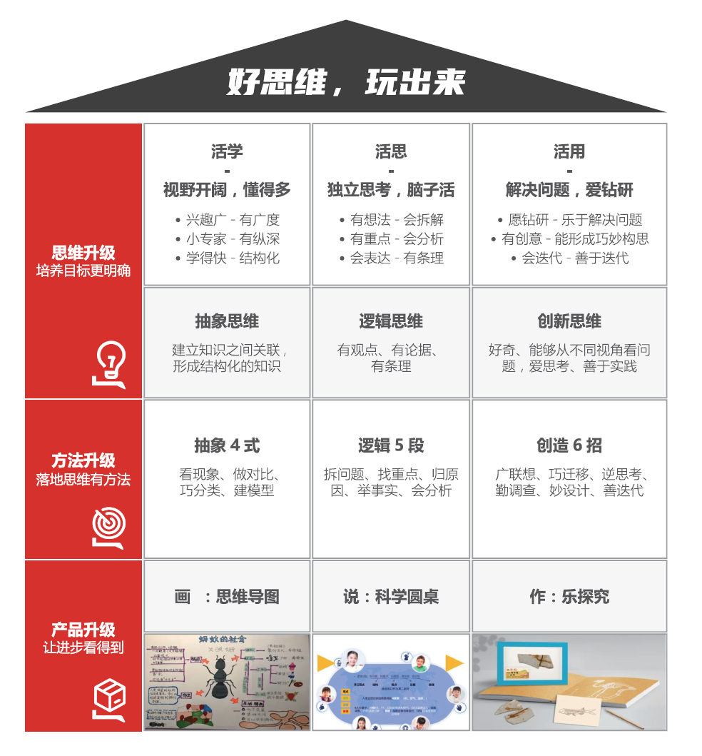 ● 三四年级:在探究实验的过程中,观察事物的特征与结构,记录数据并寻找规律,推导科学定律或者概念,在思维上则是对比、归纳概括与逻辑推理的组合提升