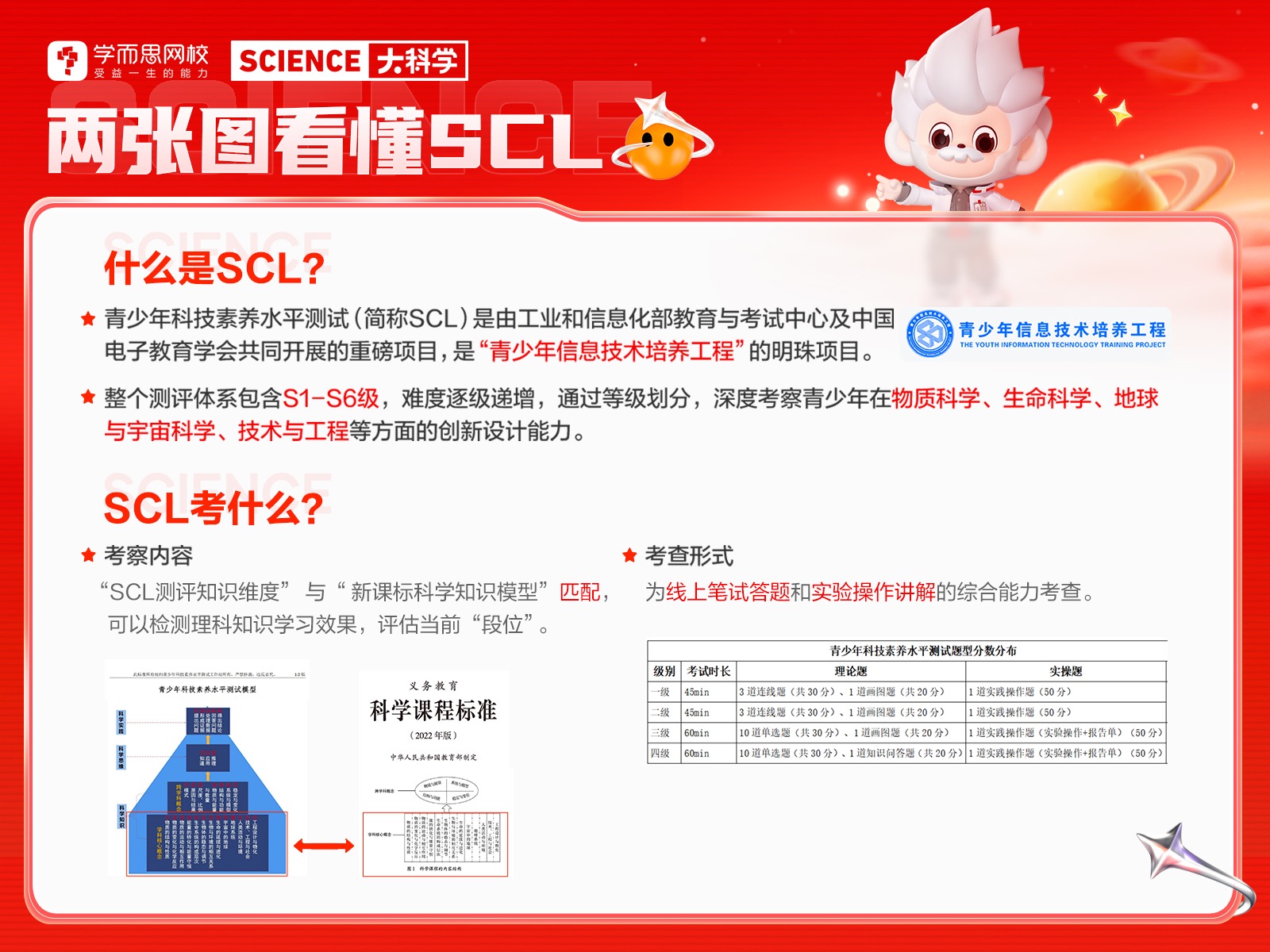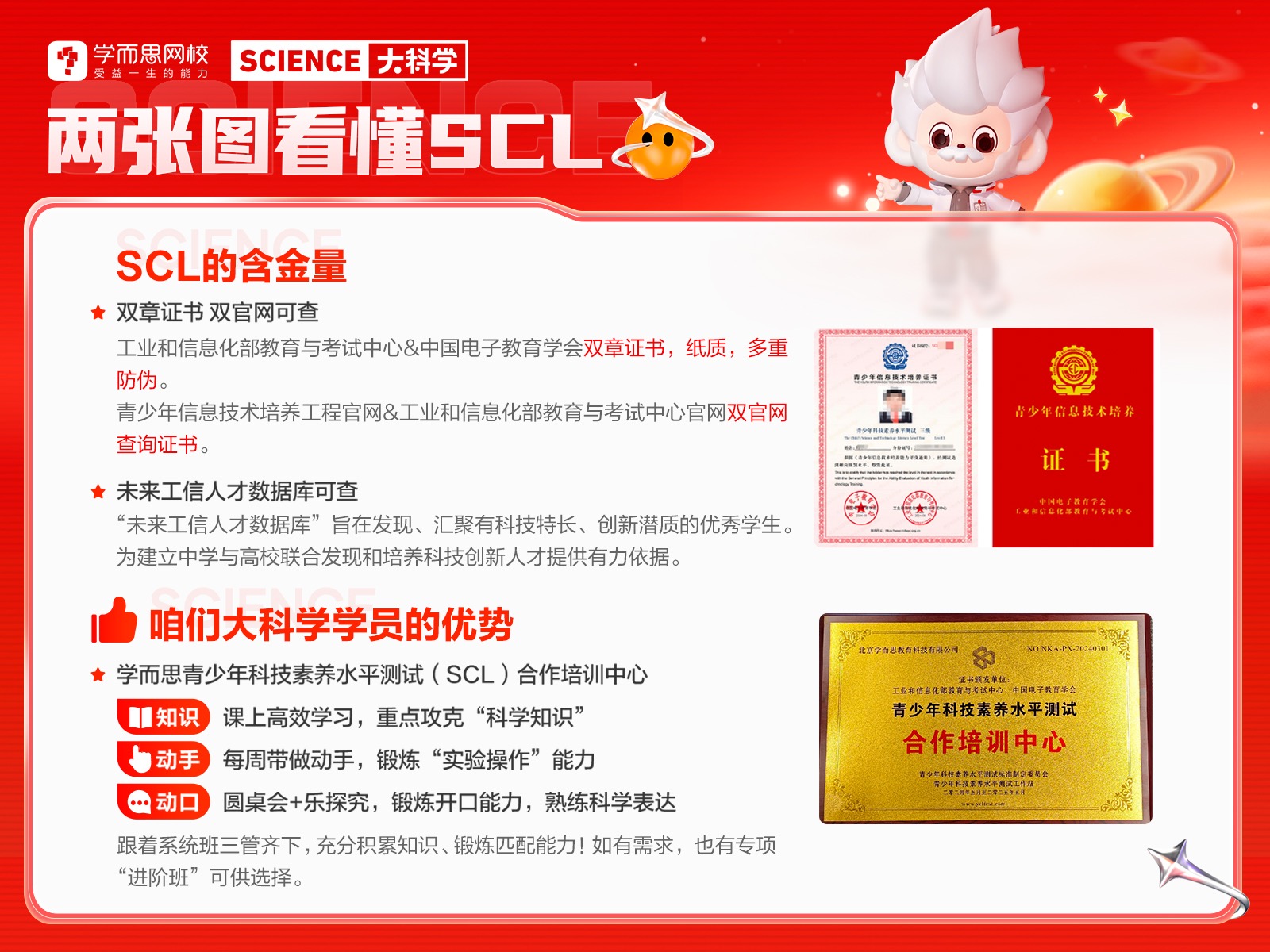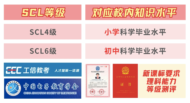 SCL考级,由工业和信息化部教育与考试中心和中国电子教育学会共同开展,被誉为青少年信息技术工程的明珠项目,考试内容也都是新课标科学知识,强关联!