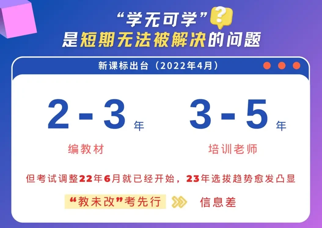 科学新课标的出台时间是22年4月,教材更新时间往往是2~3年,老师熟悉教材的时间会更长,得3~5年