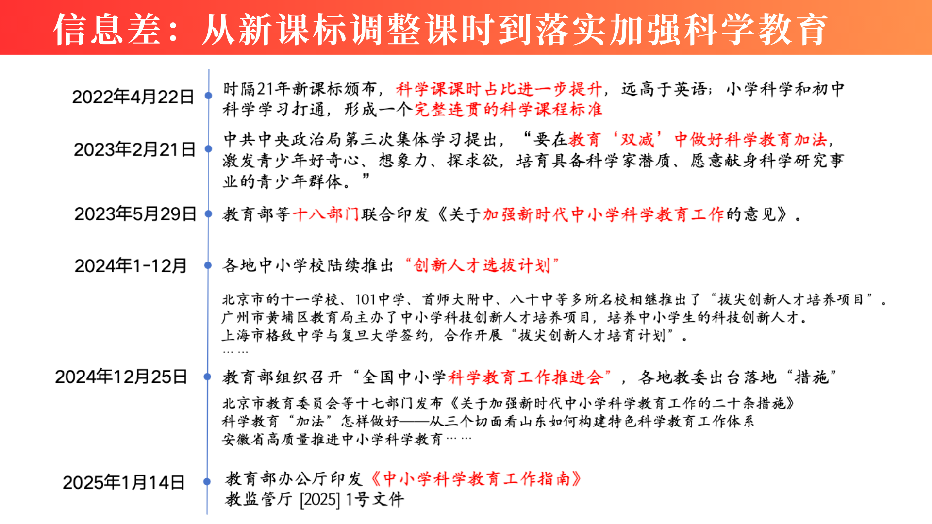 给大家先看俩政策相关的图片,第一张,从22年开始的新课标调整,到25年的科学教育工作指南,国家层面对科学教育的重视逐步加深