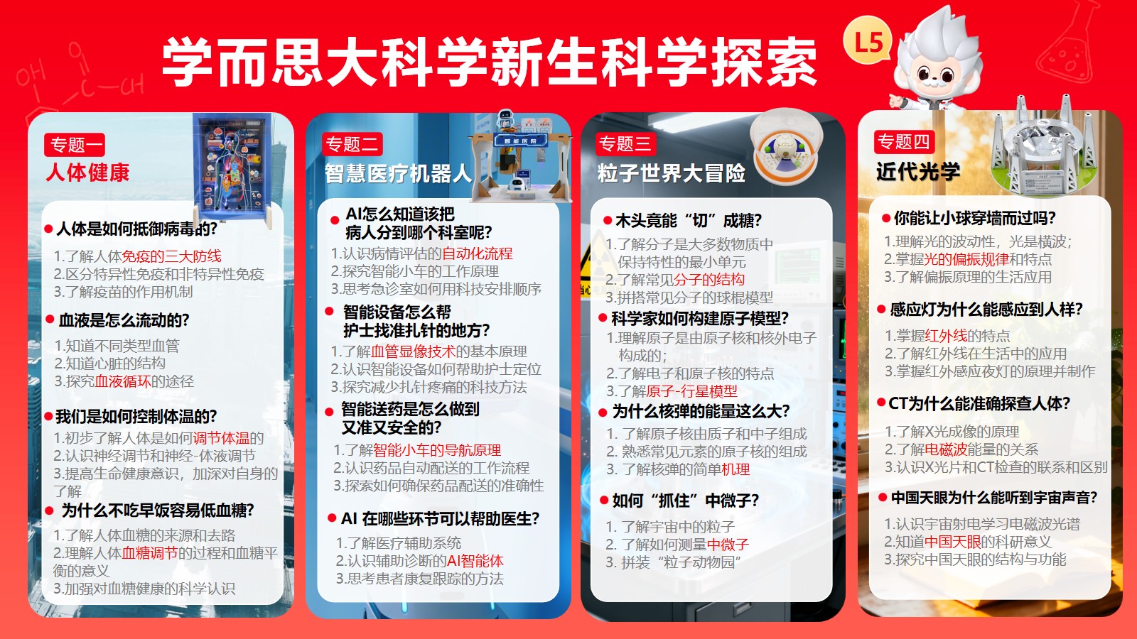 随着孩子认知的提升,五年级的孩子,会学到人体健康、人工智能、物理粒子世界、近代光学四大难度较高的主题