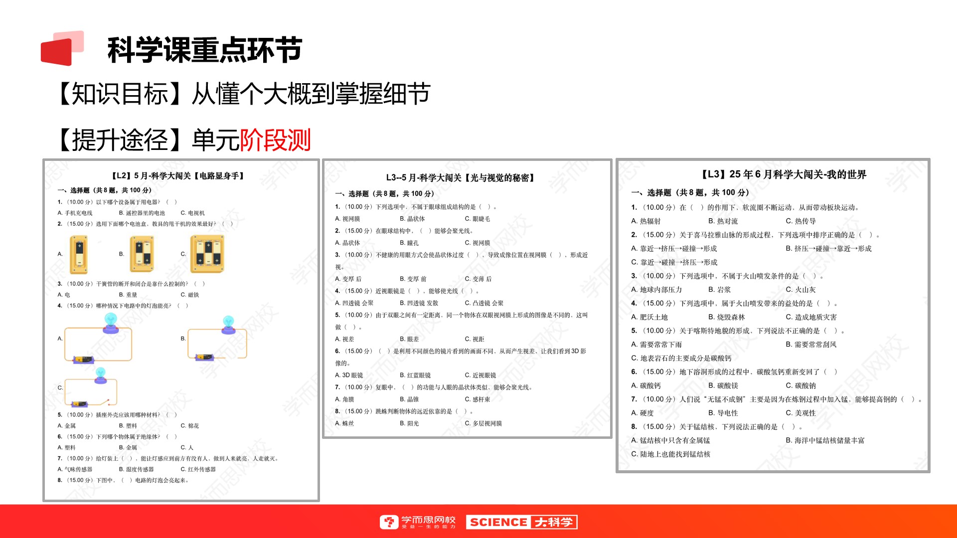 学而思大科学课的定位,不是像那些实验盒子一样随便玩个实验就结束了,而是真正地让孩子掌握科学知识,尤其是掌握校内的的知识点