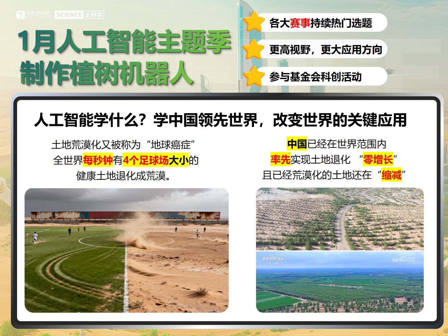再给大家看看这次科学课的白名单赛事主题,都是当下最热门的人工智能+生活应用主题,先来讲L1~L3的智慧植树机器人,孩子会学习土质分析、设计自动化种树方案、制作智能植树机器人、最后实现绿洲治沙的愿景