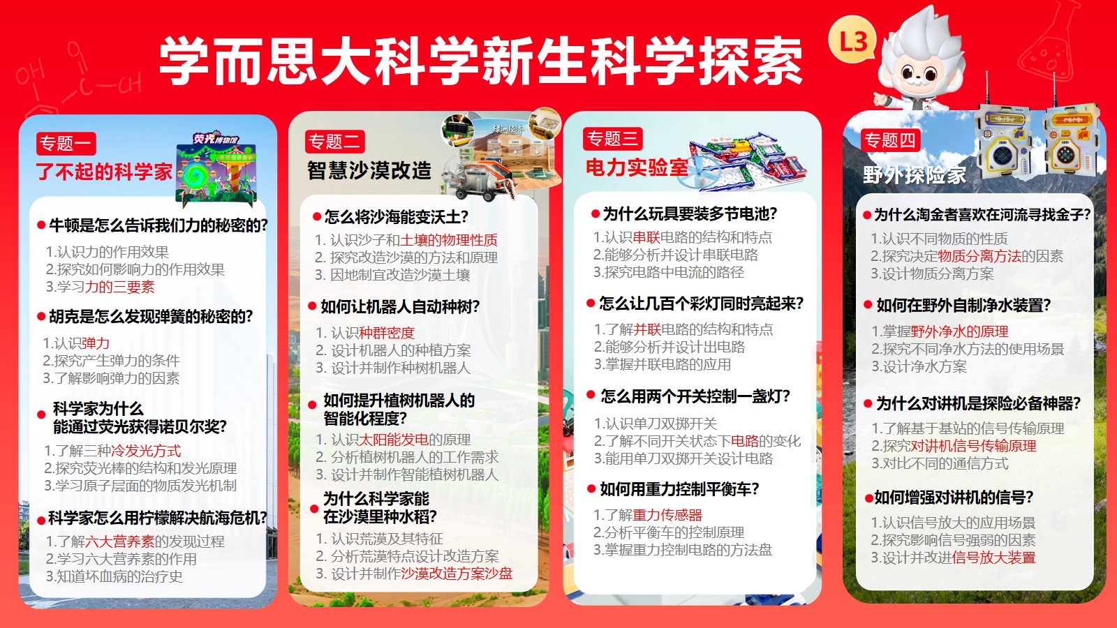 L3的课程中,会研究科学发现、人工智能、电学和野外生存四大主题的知识
