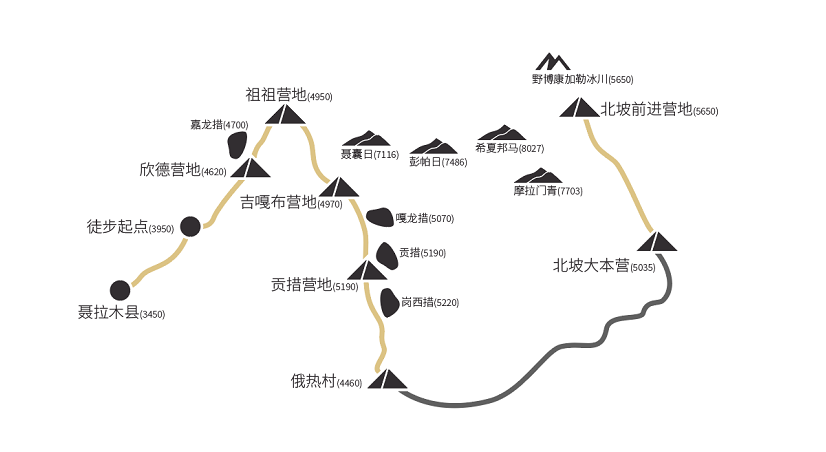 Day 1-3 拉萨-定日-聂拉木 Day 4 徒步起点-欣德营地(4620 米) Day 5 欣德营地-嘉龙措-噶龙错-祖祖营地(4950 米) Day 6 祖祖营地-吉噶布营地(4850 米) Day 7-8 吉噶布营地-贡措营地(5190 米),贡措营地休整一日 Day 9 贡措营地-俄热村(4460 米)(就此大小环队员分两路,小环返程定日,翌日乘车至拉萨,大环队员去往北坡大本营) Day 10 北坡大本营-前进营地(5400米) Day 11 前进营地-野博康加勒冰川(5650米)-前进营地 Day 12 前进营地-北坡大本营-定日 Day 13 定日-拉萨