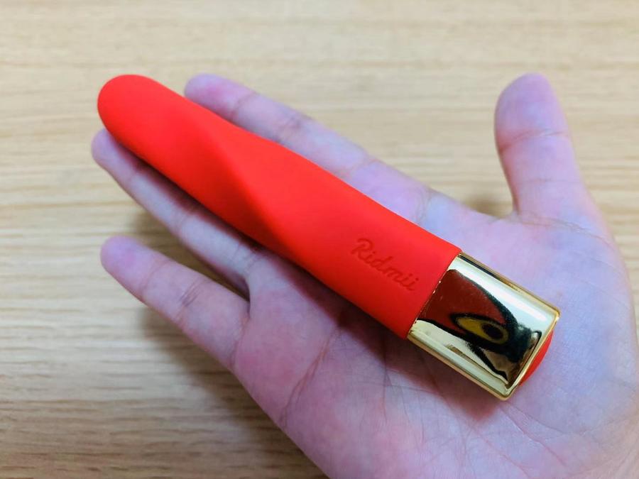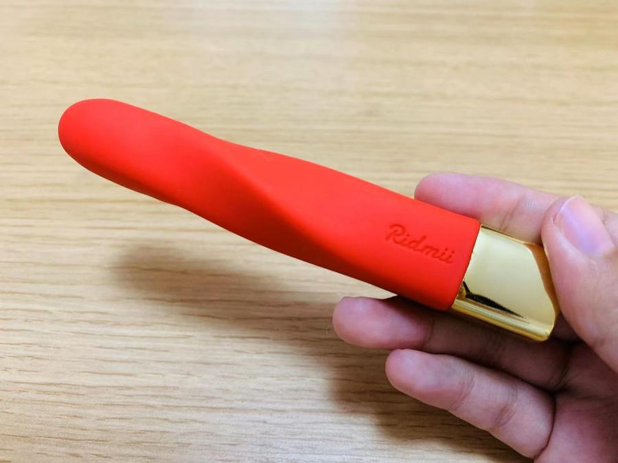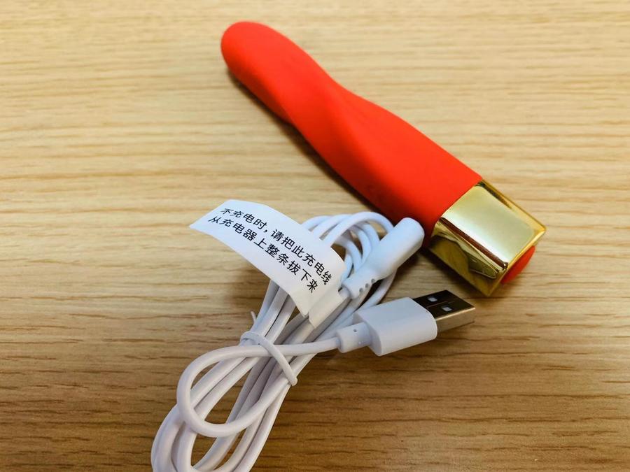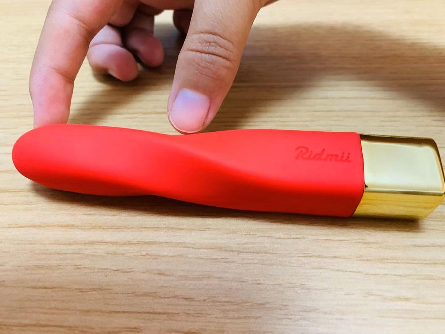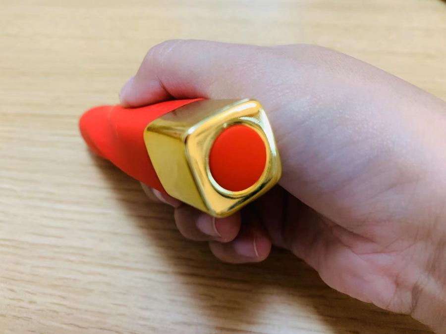 口红整体呈螺旋形,长度大概是两根手指左右,全身是玫红色软硅胶,手感极好,而底部是金色的手握处,给了整个产品不一般的质感,底部就是红色的开关按钮啦。