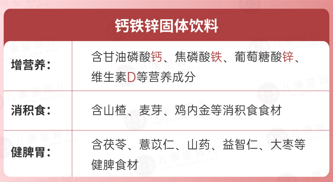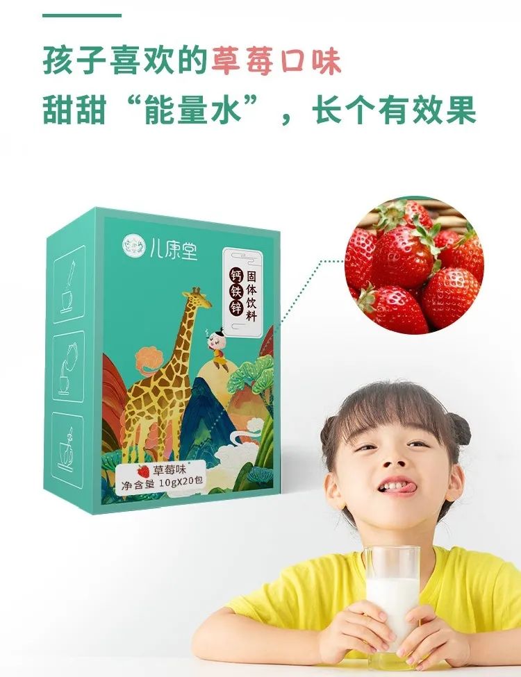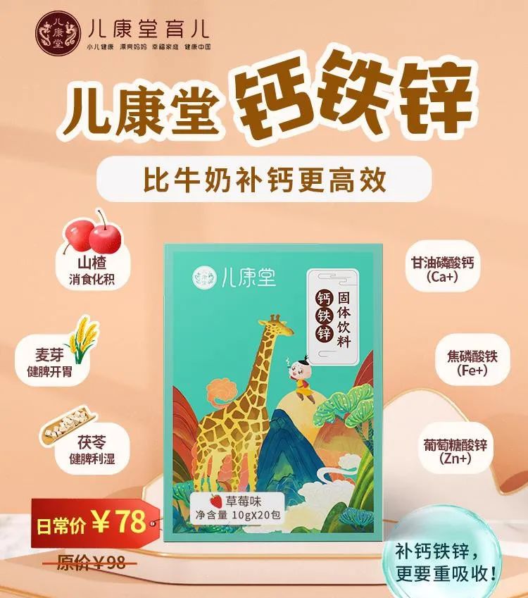 要帮孩子长高长肉,仅靠单一的营养成分很难有所补益。所以我们把【钙、铁、锌】同时加入到配方中,实现一剂补3样,让娃的身高如雨后春笋一样,节节高。维生素D的作用就是促进钙吸收,就像一艘运输船,有了它的护送,才能让钙完成被人体吸收的过程。没有维D,你们给娃补充的钙就会大量流失,不能补到骨头里,也就无法真正帮他长高。再把所有的成分研磨成粉,经过现代工艺,十几味有效成分被融合进一袋10g的冲剂里。简单的用温水冲泡,就可以帮娃实现钙铁锌同补+健脾消积食,还不用担心伤到体质。健康又安全,特别适合孩子喝~药食同源系固体饮料,是儿康堂的爆款,像葱白淡豆豉、可可宝、葆化茶...常年买断货,深受宝妈和宝宝的喜爱。所以我们也把【钙铁锌】做成了饮料形式,既省去了大家做食养方的功夫,微甜的口味,宝宝也喜欢,不用哄就一饮而尽。而且固体饮料是可以互相搭配喝的,如果宝宝感冒了,葱白淡豆豉+钙铁锌;咳嗽了,可可宝+钙铁锌...非常方便,当宝宝出现小症状时,随时冲泡一杯,及时干预把小病症扼杀在摇篮里。 冲剂的形式,也比钙片这种块状固体,更易被宝宝吸收消化。