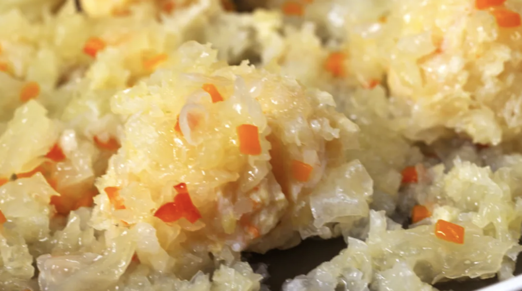 5、碗中加入3克盐、胡椒粉调味,将肉泥揉成乒乓球大小的丸子,将丸子均匀裹上一层银耳碎
