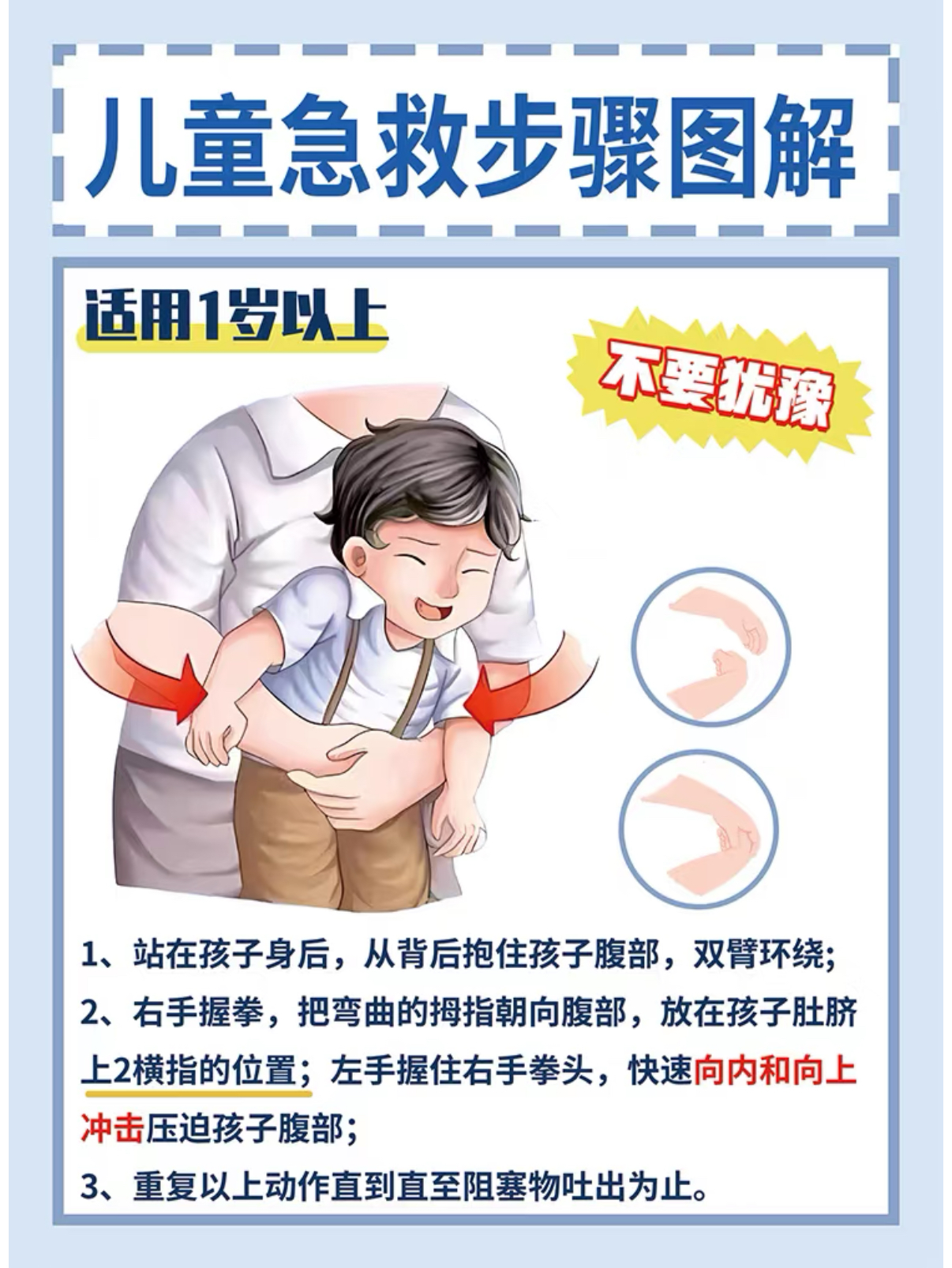 3.然后用力快速向里收紧手臂,同时向上冲压宝宝的肚子,连续5次,重复这个动作直到孩子吐出异物或者能用力咳嗽、哭出声为止。