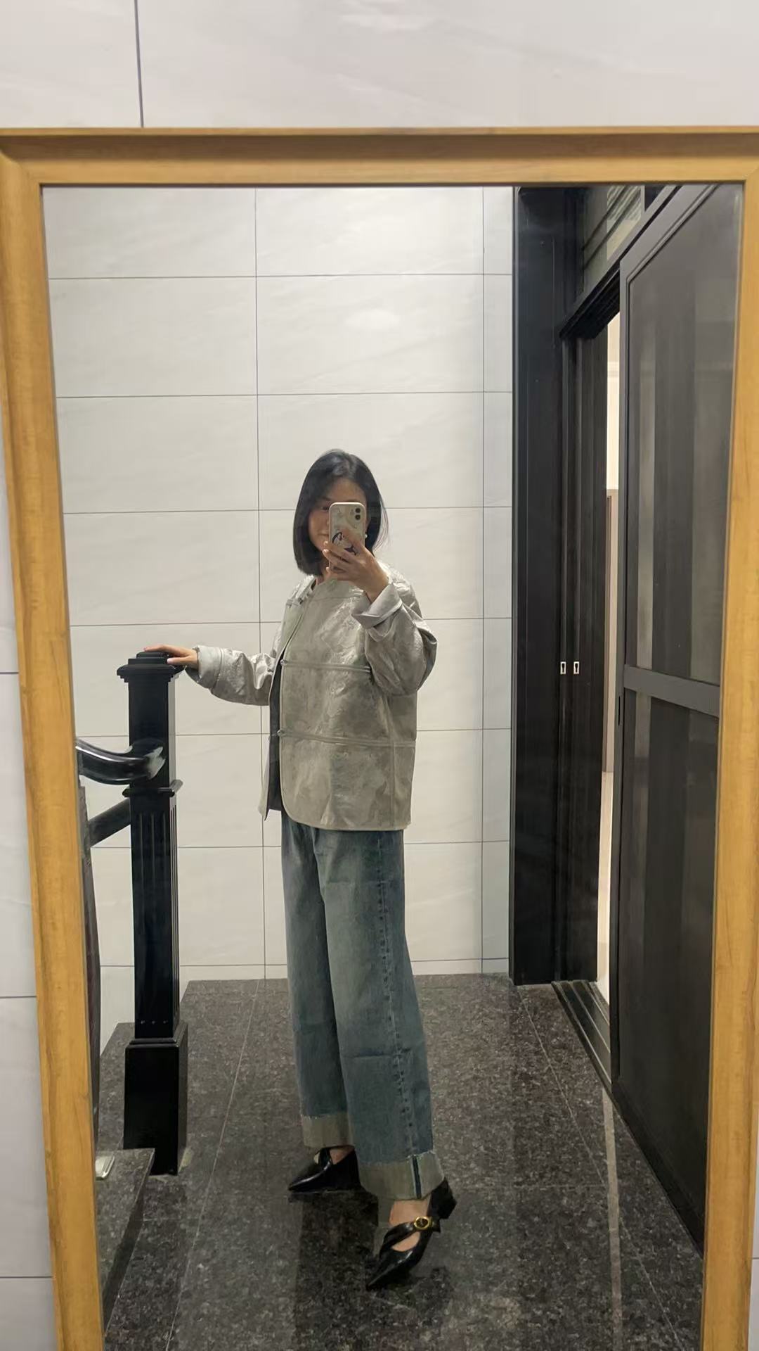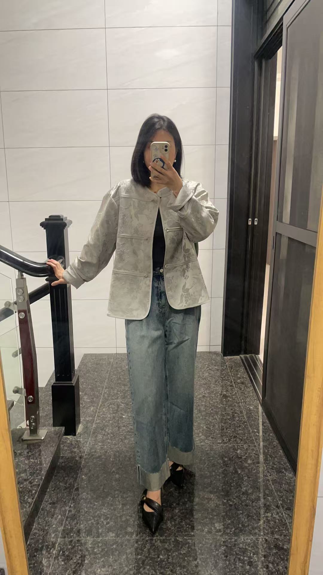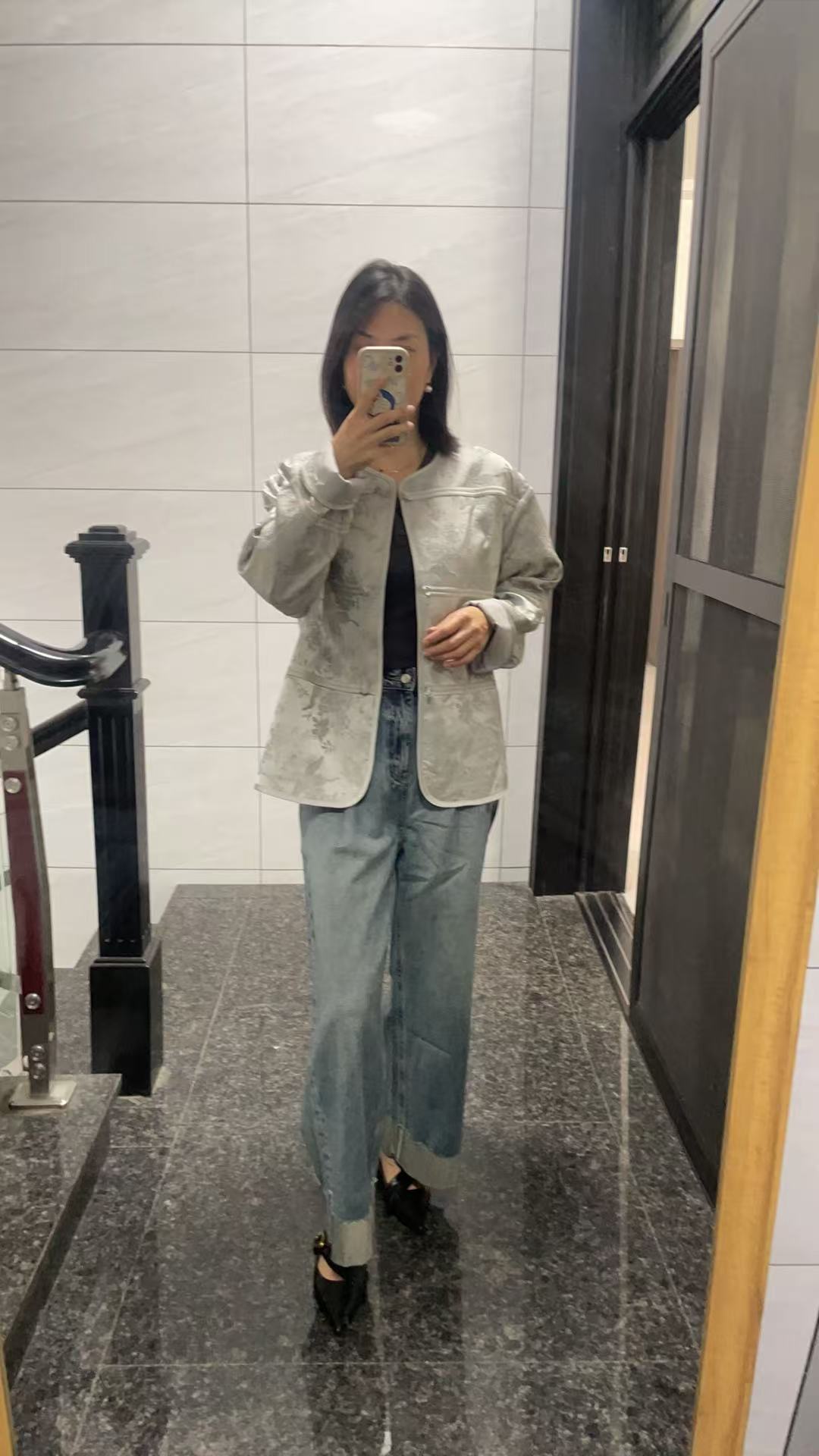 低调奢华范!浅灰色提花短外套 + 牛仔阔腿裤穿搭
