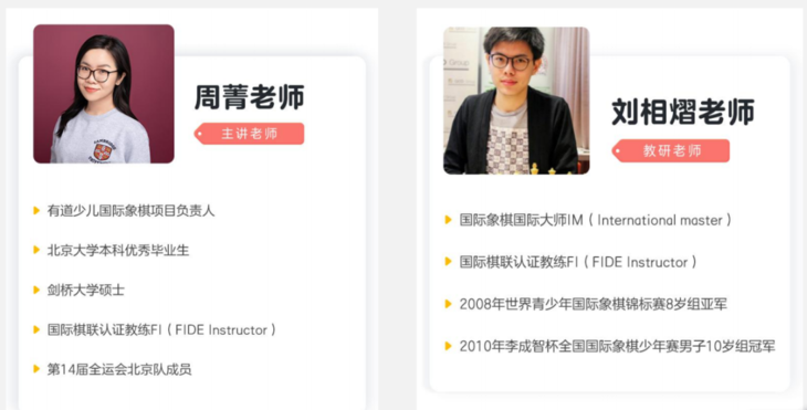 项目负责人/主讲周菁老师,毕业于北京大学,并获得剑桥大学硕士学位,还代表北京队参加过第14届全运会。资深教研刘相熠老师8岁就获得过世界青少年国际象棋锦标赛亚军,同时也是国际大师并持有棋联认证教练证。(这还只是有道国象部分师资展示)