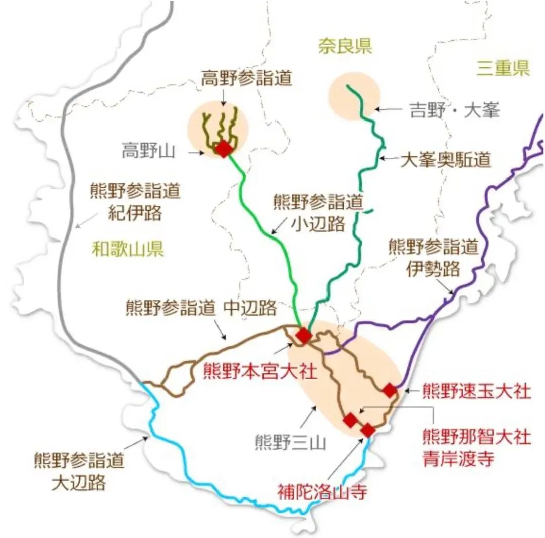 如今的熊野古道包括小边路、大边路、中边路、伊势路、纪伊路五条线路,总长加起来超过1000公里,其中纪伊路并未被纳入世界文化遗产的范畴之内,而中边路则以参拜熊野本宫大社、熊野速玉大社、熊野那智大社这三大神社成为熊野古道最经典、最受欢迎的核心线路。