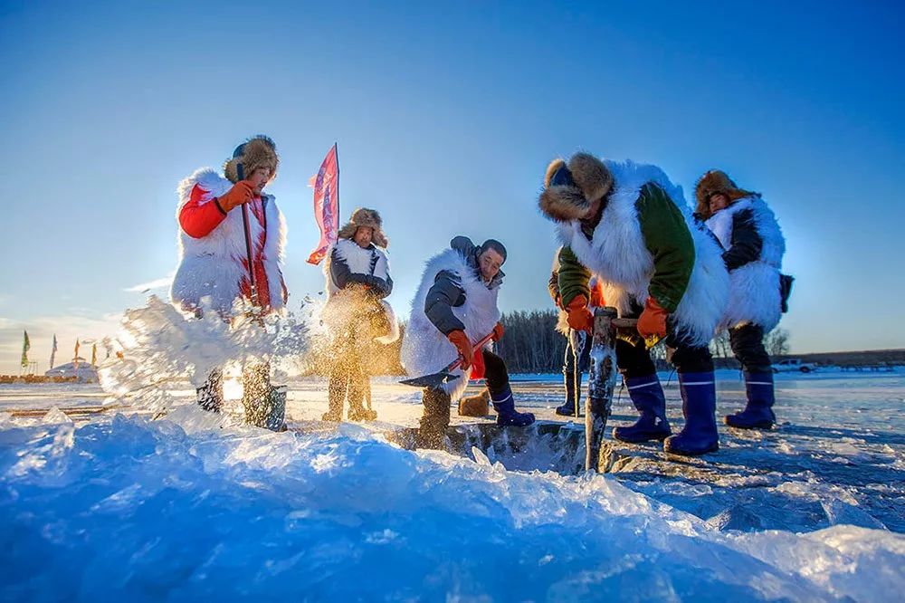 在漠河可以看一场原始的冬捕,感受东北的民间传统。还有机会品尝“水中活化石”、野生的漠河特产: