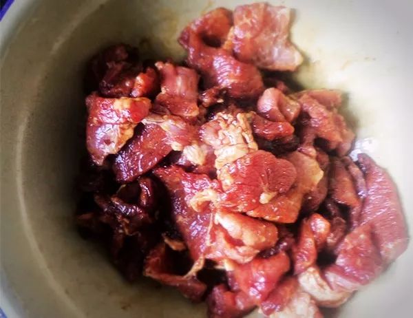 2、将肉切成薄片放入葱姜,1勺酱油,1捏花椒面腌渍一会备用;