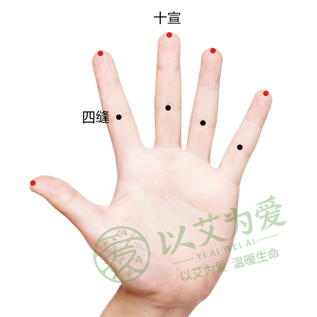 十宣(在十指尖端,去爪甲一分,双手共10穴)。两手交换,一手母食指岔开,一指一指挨着捏压两侧,10指共捏2—3分钟。