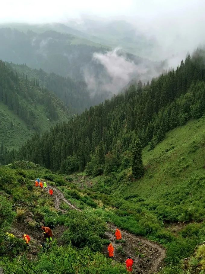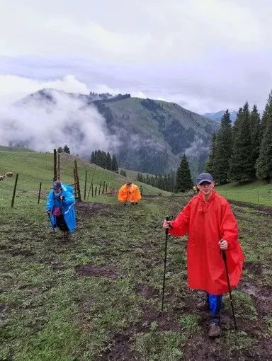 下午五点左右,开始下起了雨,伴随着电闪雷鸣,雨越下越大。大家排成一行,冒着风雨,艰难地在泥泞湿滑的草地上爬升、爬升、再爬升。雨越下越大,道路越来越泥泞。