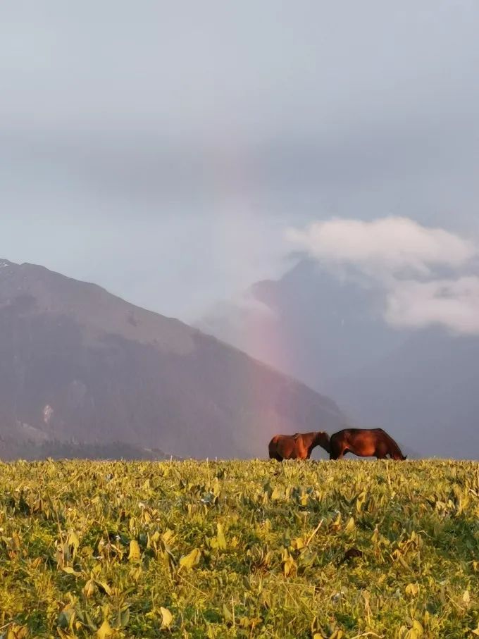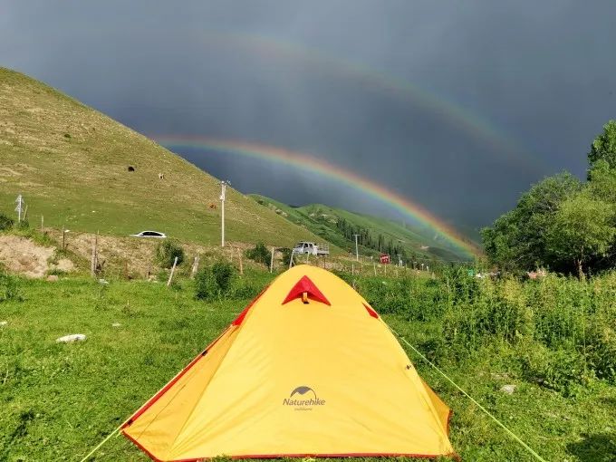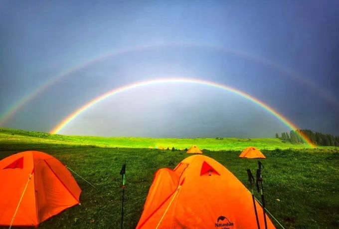 这场大雨一口气下了半个多小时,我甚至能感觉到坡地上的雨水从帐篷下汩汩流过。忽然,天色骤然亮了起来,雨点却依然啪啪地打在帐篷上,有了前几天的经验,我判断一定是天有异象。冒雨钻出帐篷,果然,东边乌云盖顶、西边阳光明媚,山坡上的草甸明暗相间、泾渭分明,两道异常靓丽的七彩长虹赫然悬挂在天际。