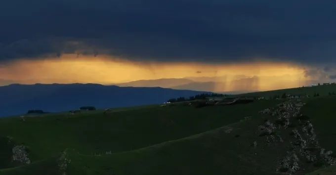 到了傍晚九点,忽然风起云涌,乌云盖顶,山雨欲来。西边落日之处,一道耶稣光,穿破乌黑的浓云,将璀璨的阳光挥洒在黛色的山峦原野之间,瑰丽壮美,摄人心魄。
