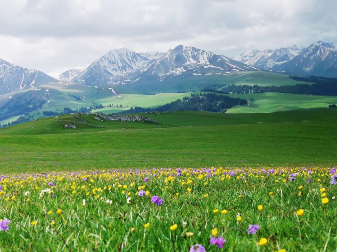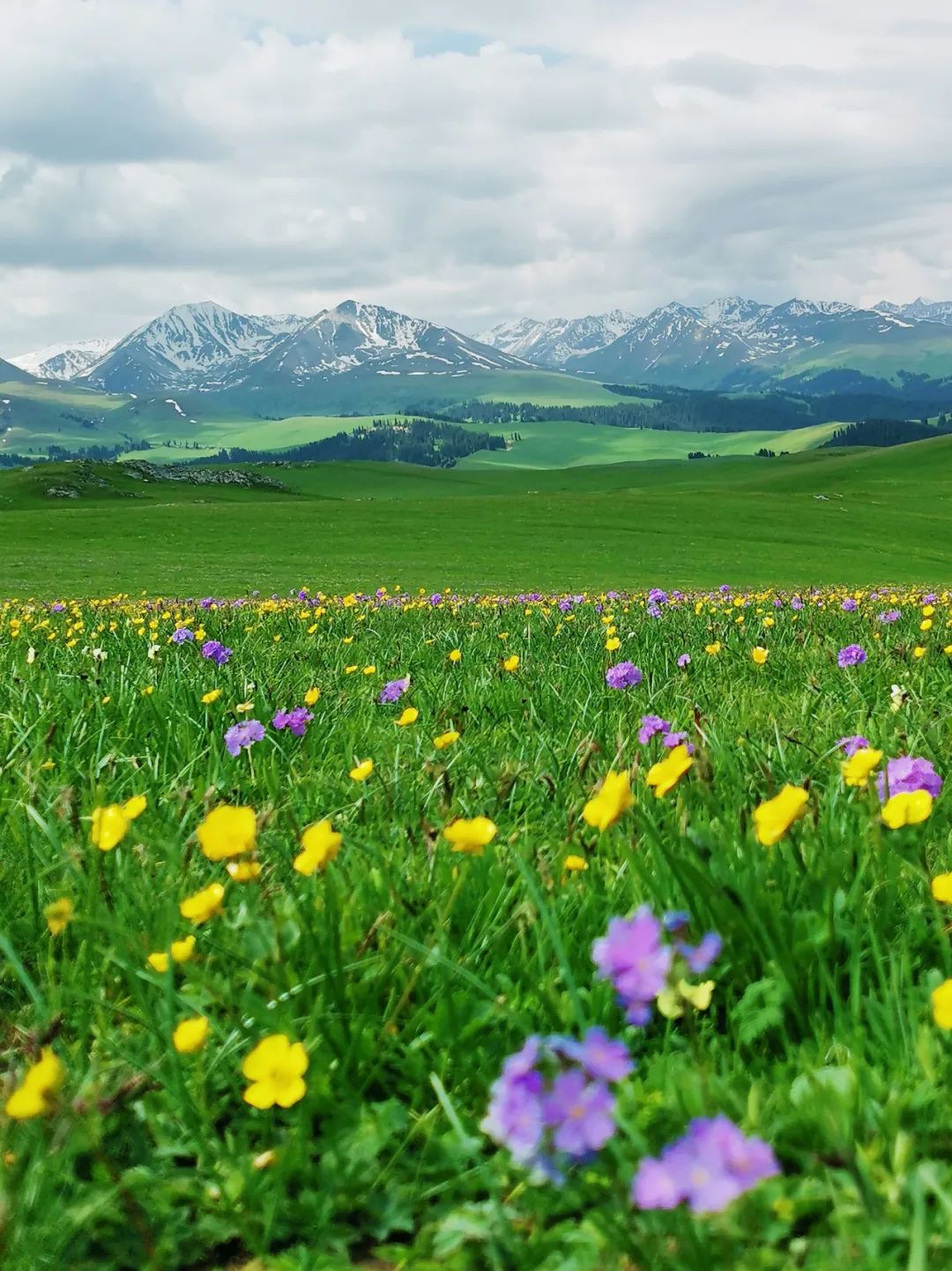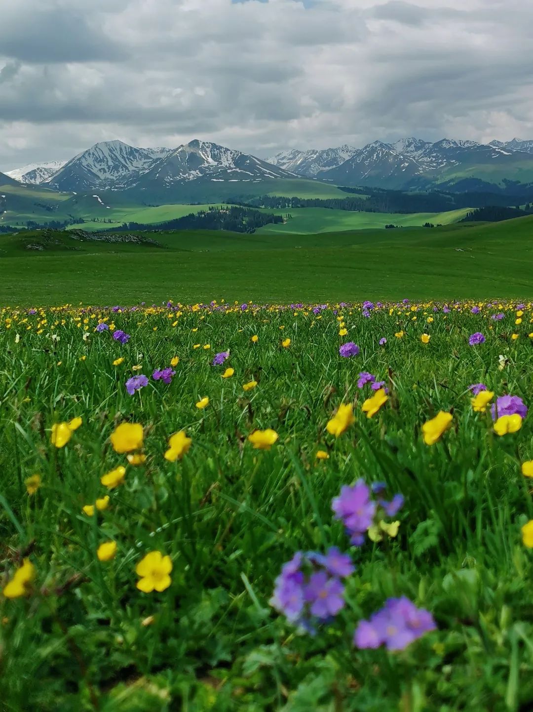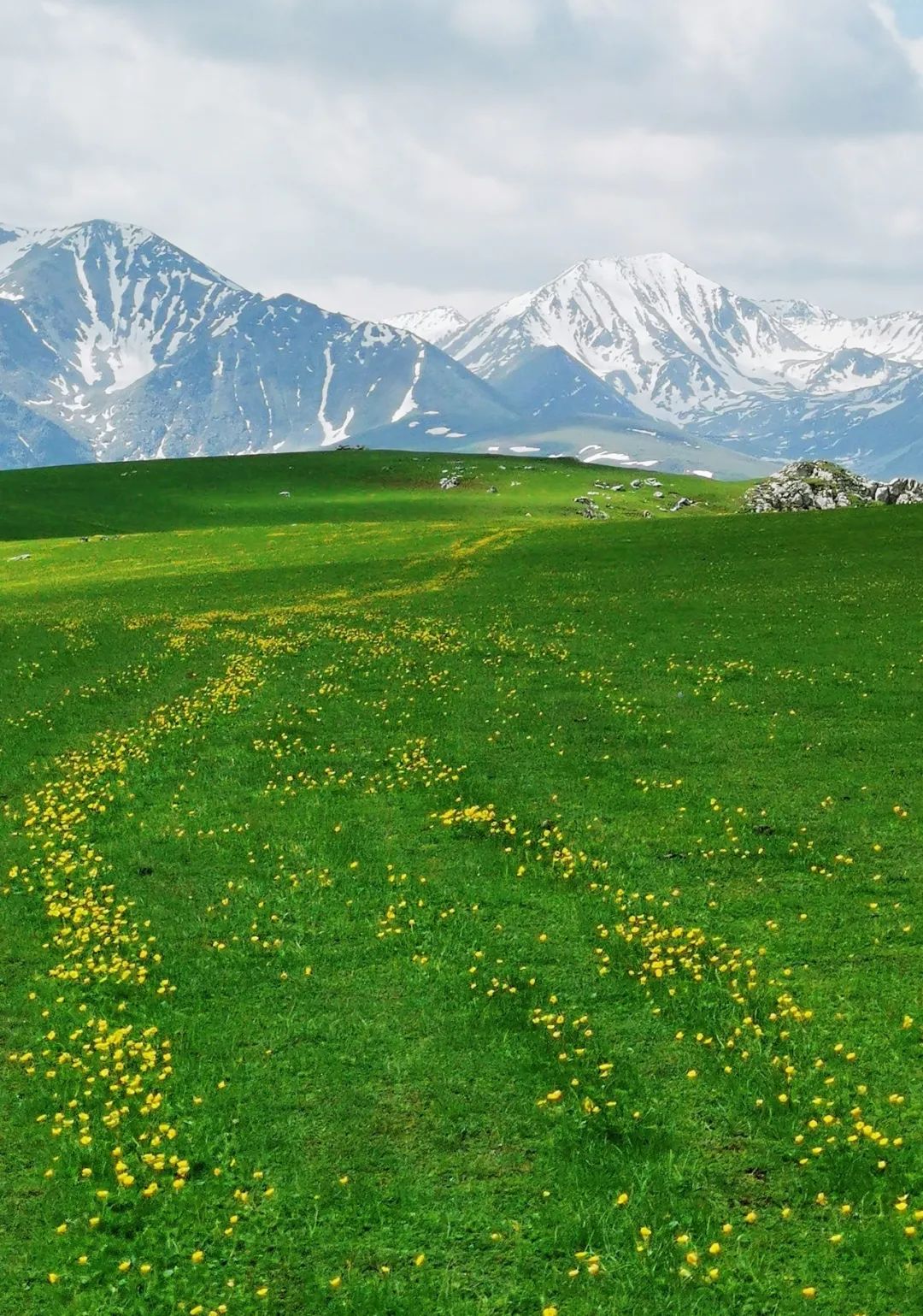 5 月下旬到 6 月中旬的喀拉峻,迎来了一年之中最美的盛放。百余种高岭之花在莽莽绿色草原竞相盛开,仿佛织就了一片片繁花似锦的柔软地毯,无边无际地延伸至皑皑白雪覆盖的天山脚下。
