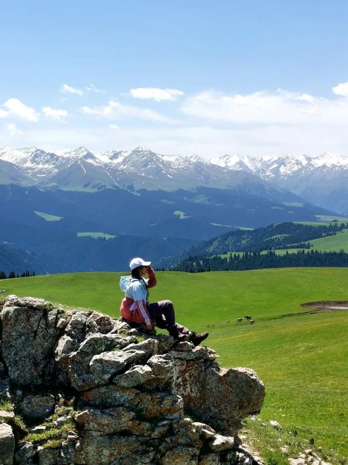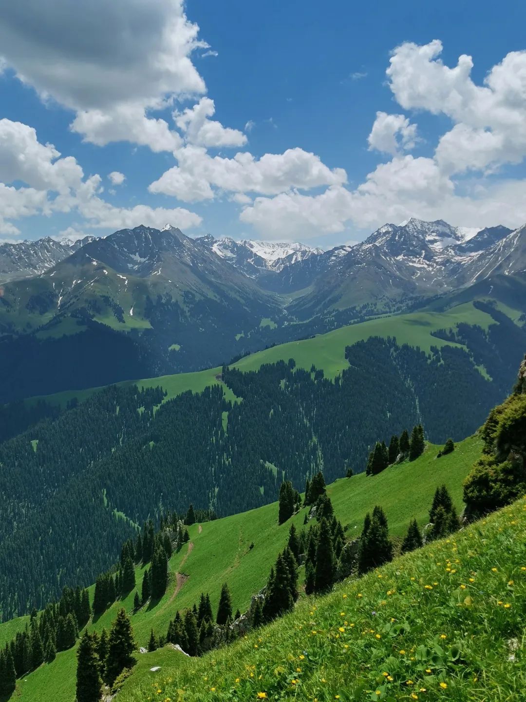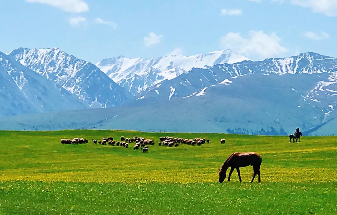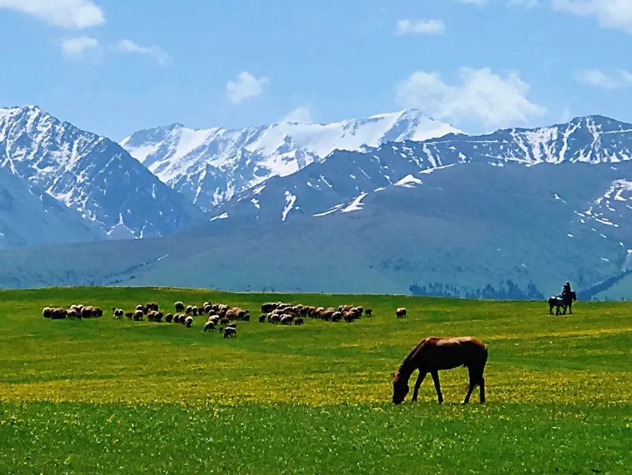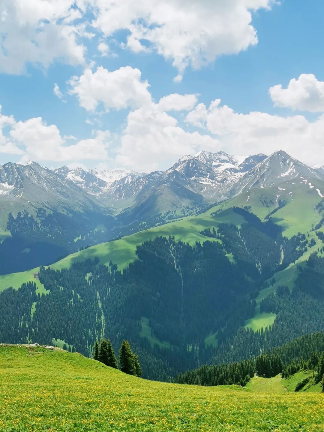 5 月下旬到 6 月中旬的喀拉峻,迎来了一年之中最美的盛放。百余种高岭之花在莽莽绿色草原竞相盛开,仿佛织就了一片片繁花似锦的柔软地毯,无边无际地延伸至皑皑白雪覆盖的天山脚下。